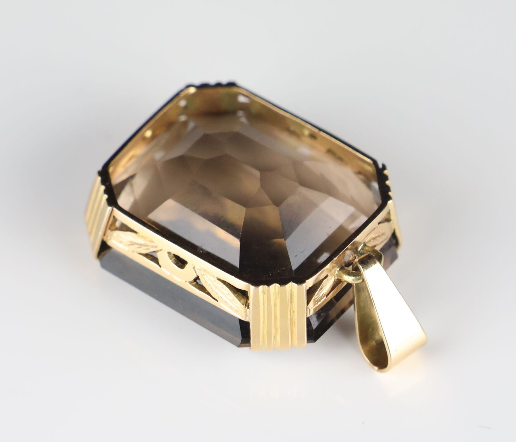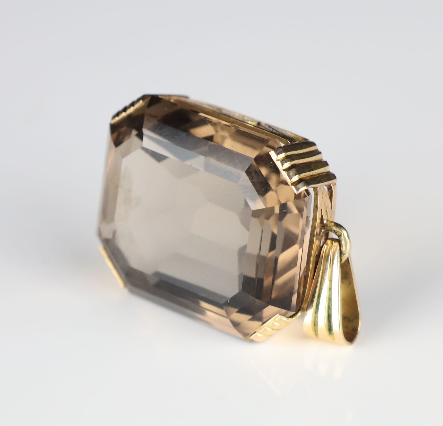 Yellow gold pendant set with a large emerald-cut smoky quartz weighing approximately 65 carats.