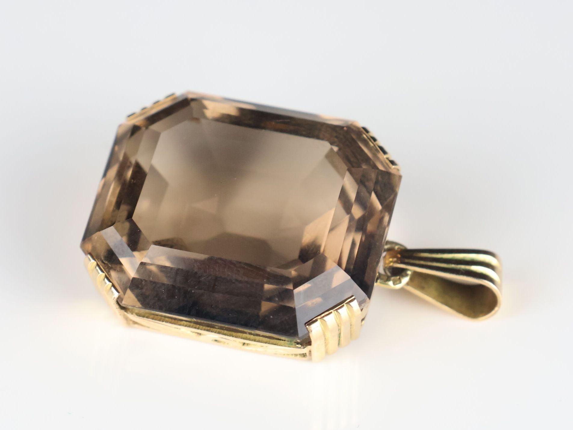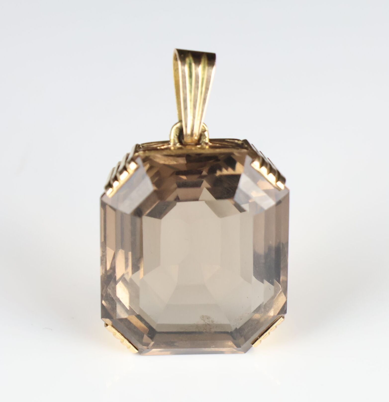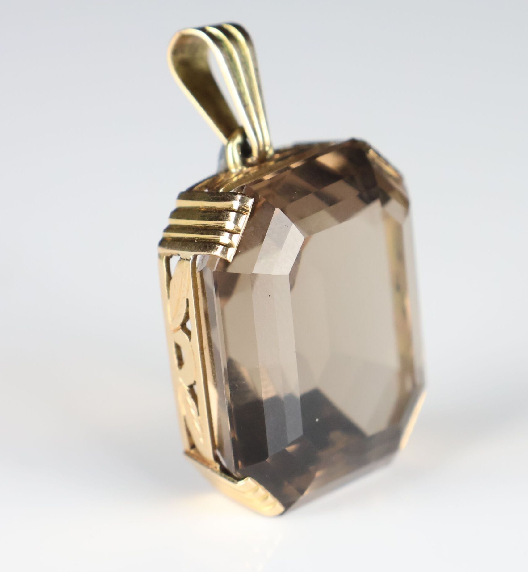 Yellow gold pendant set with a large emerald-cut smoky quart…