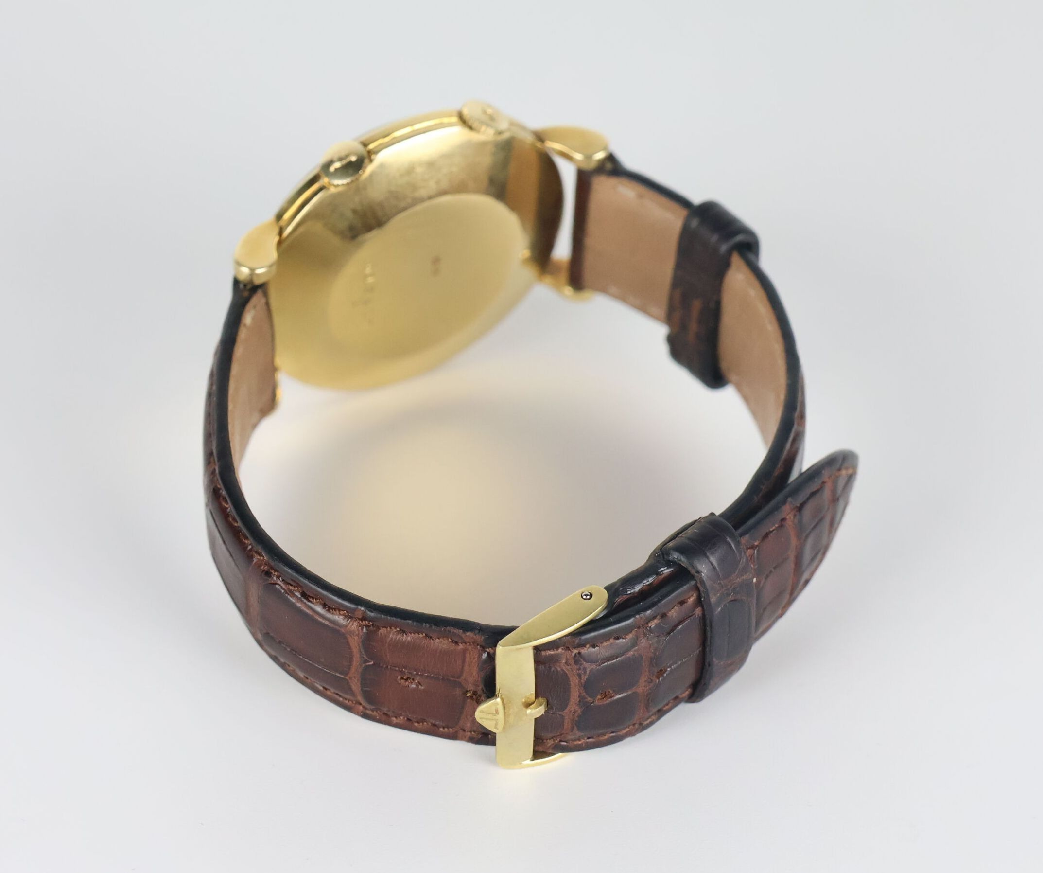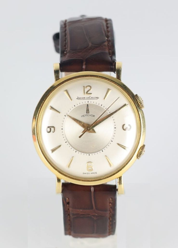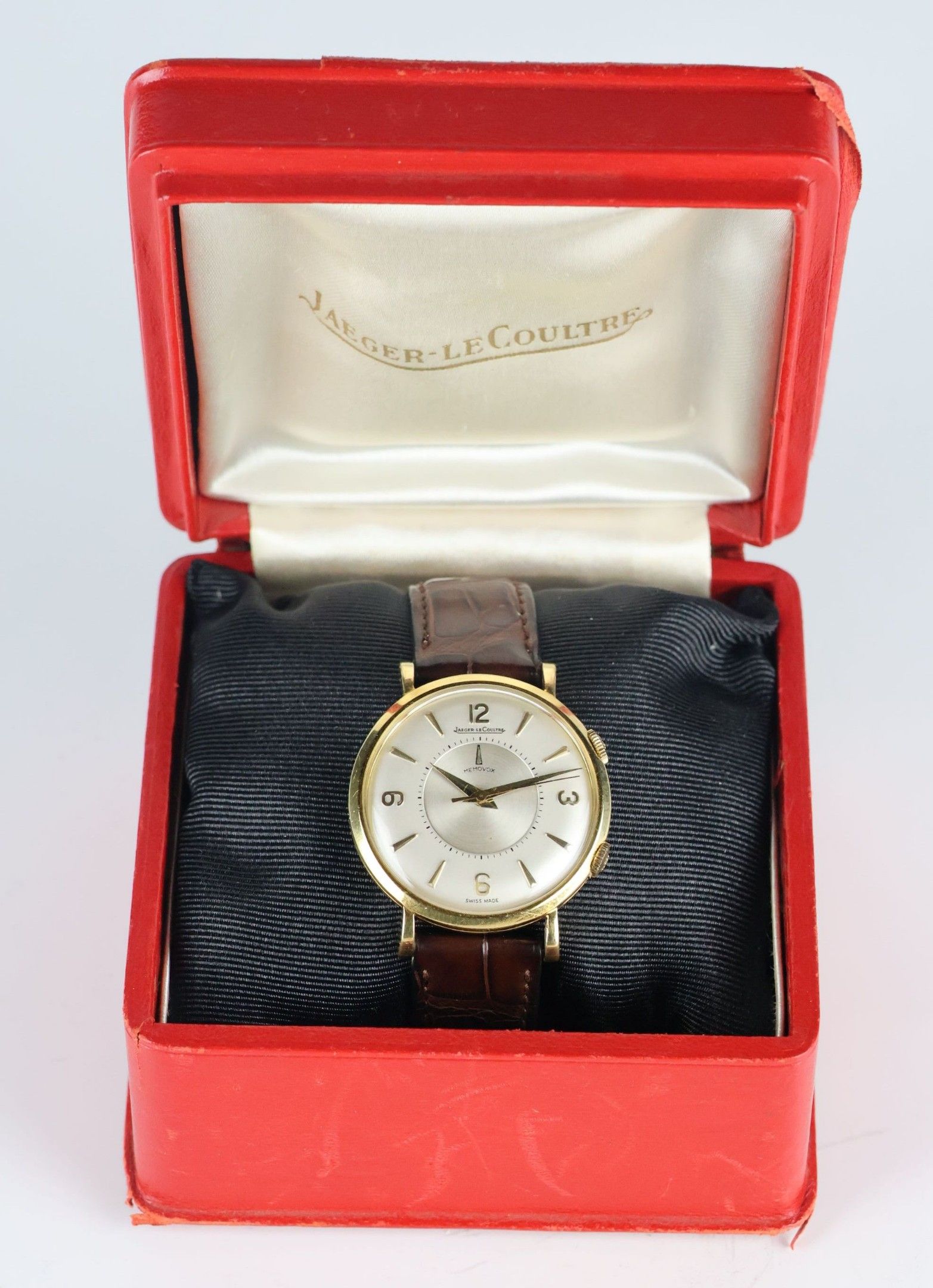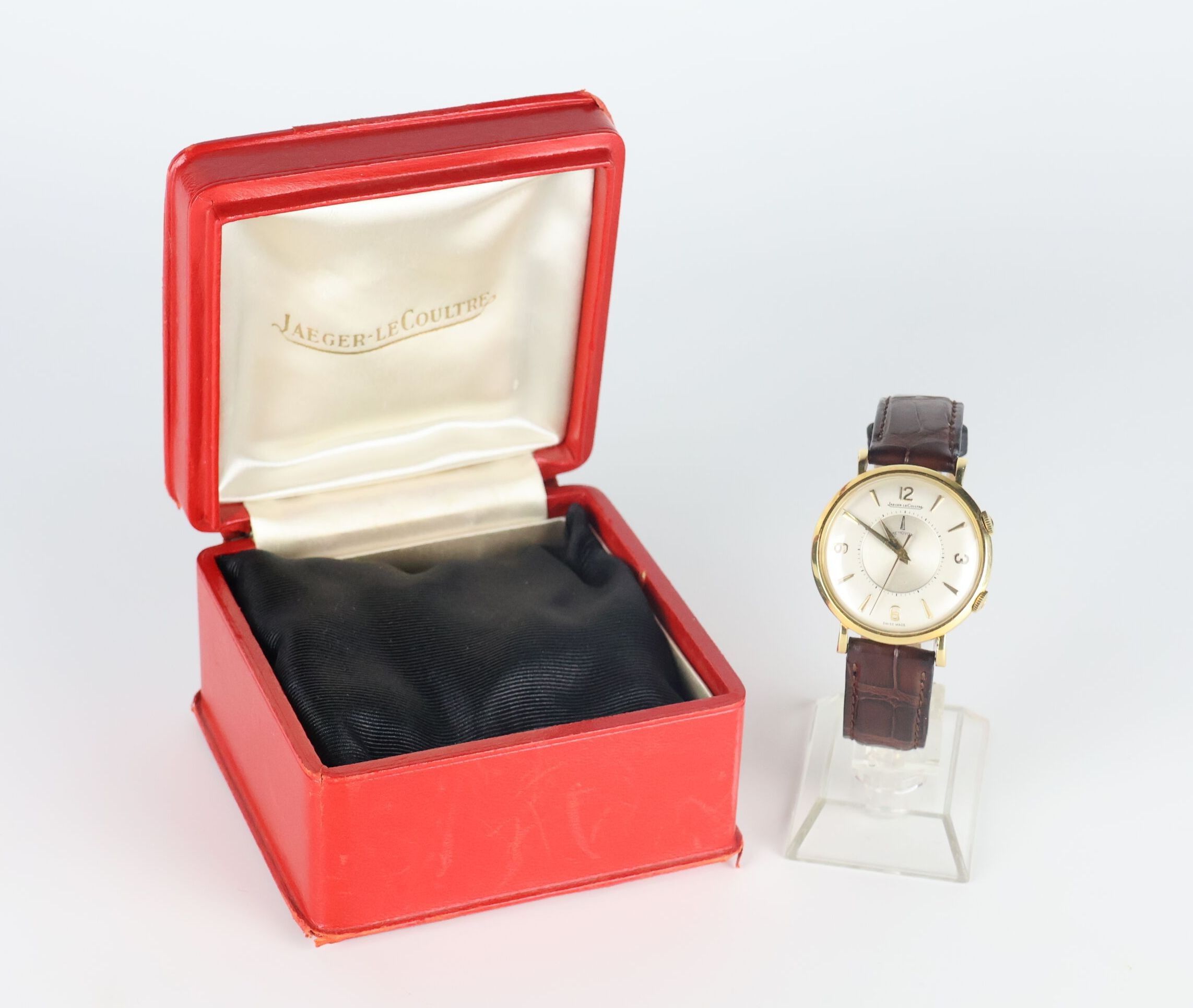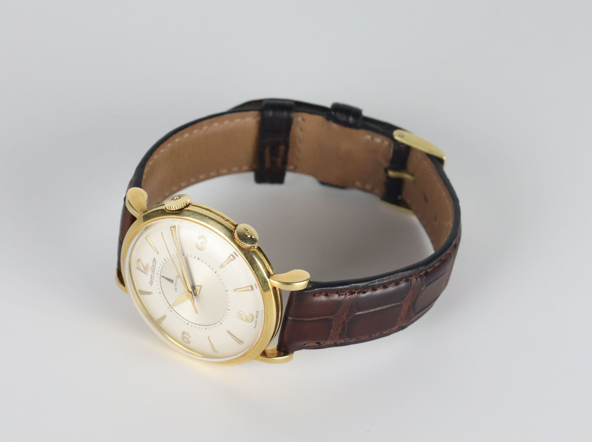 Strap/clasp: unsigned leather strap with Jaeger-LeCoultre gold-plated buckle.