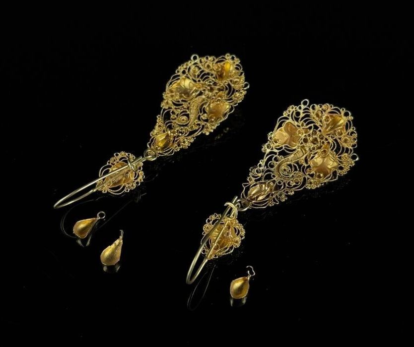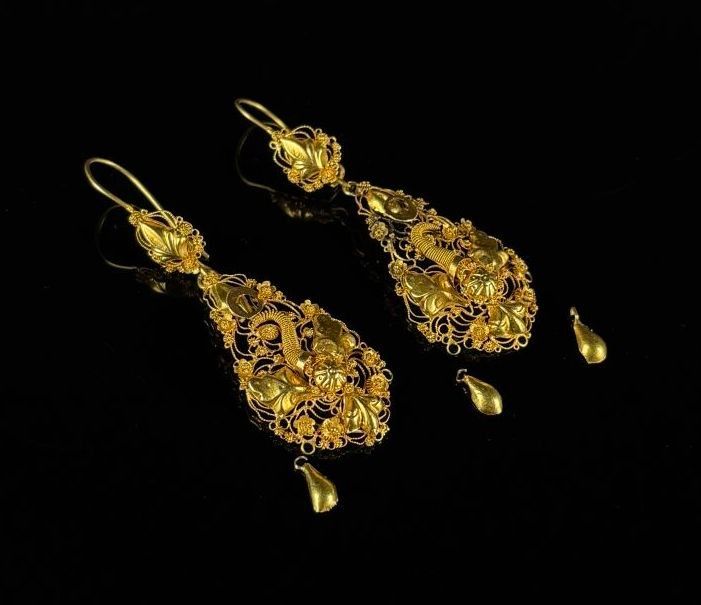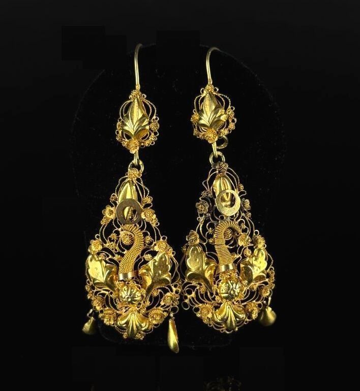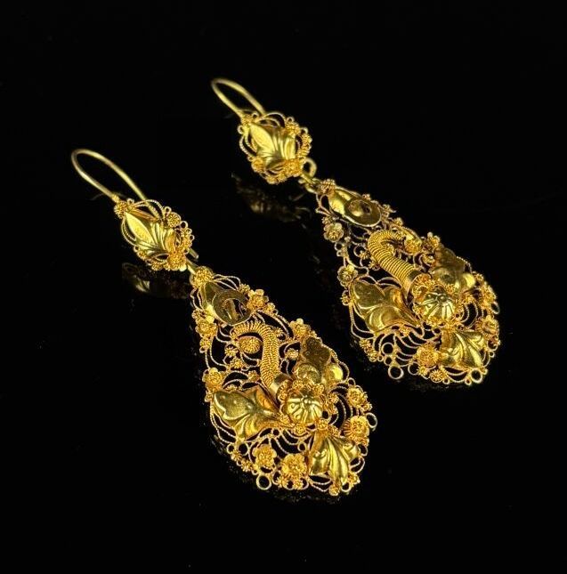 Pair of yellow gold fishhook earrings with filigree decoration and plant motifs.