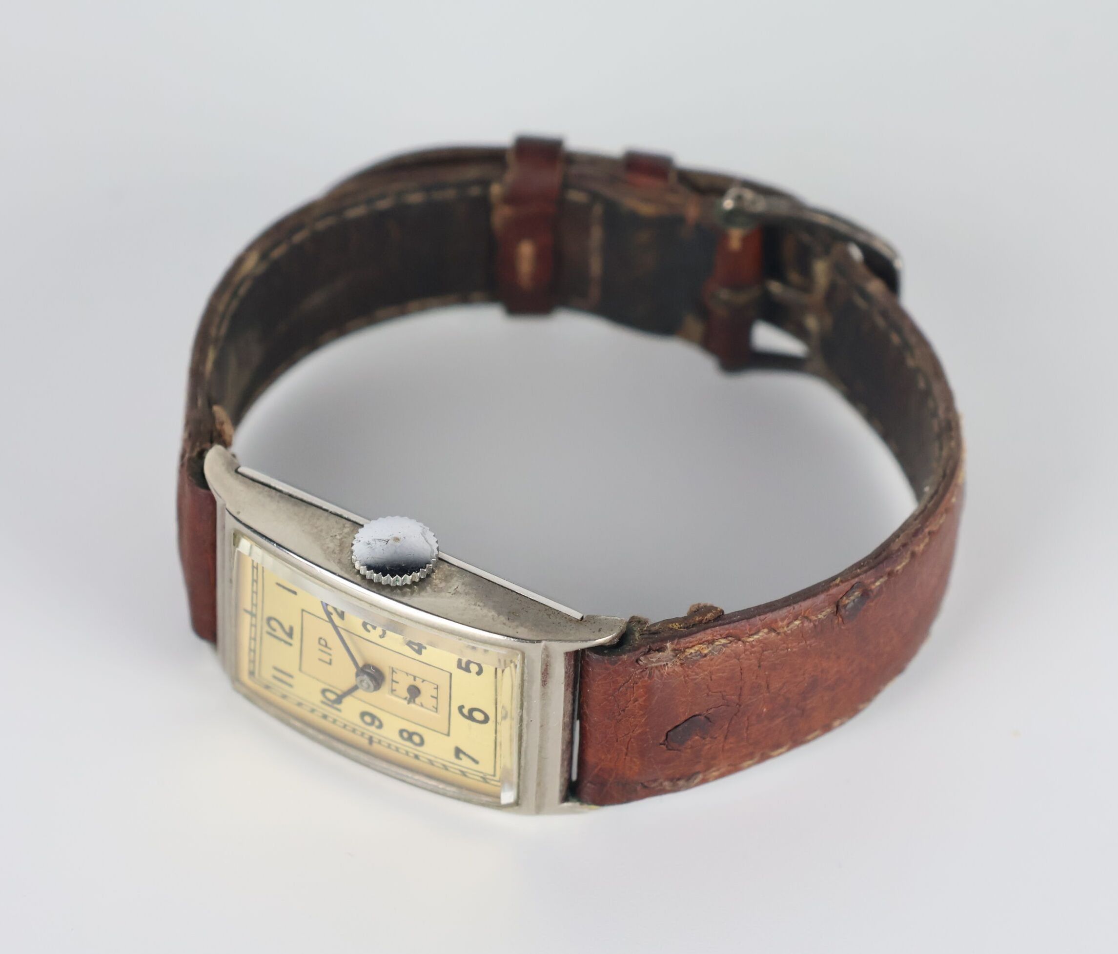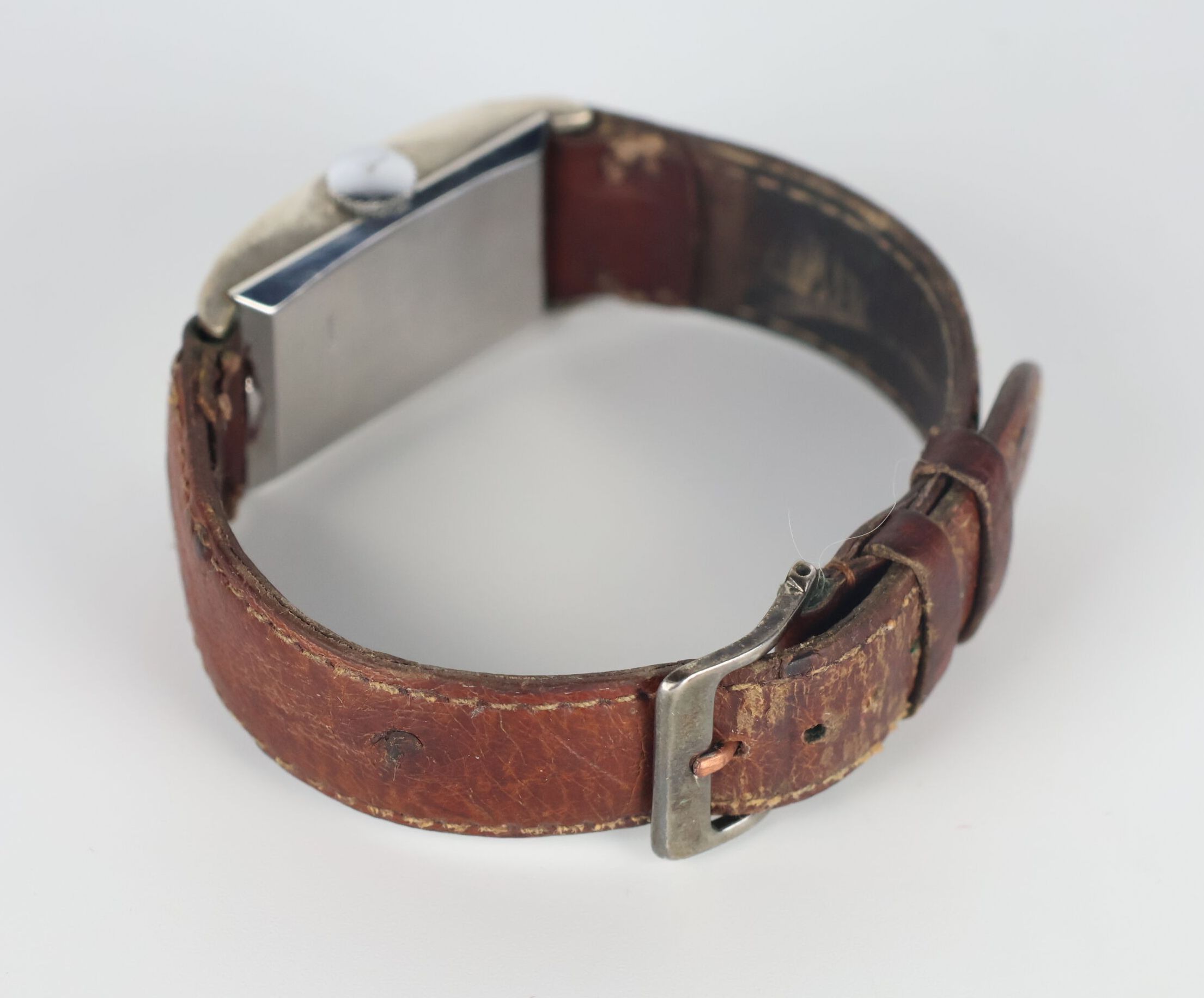 Strap/clasp: leather strap and steel pin buckle, unsigned.