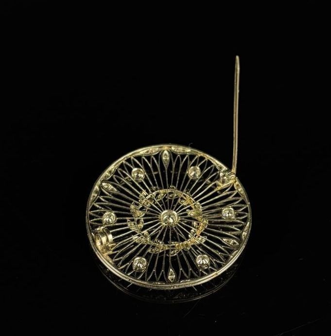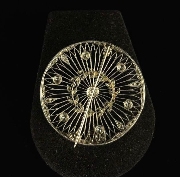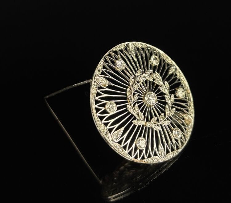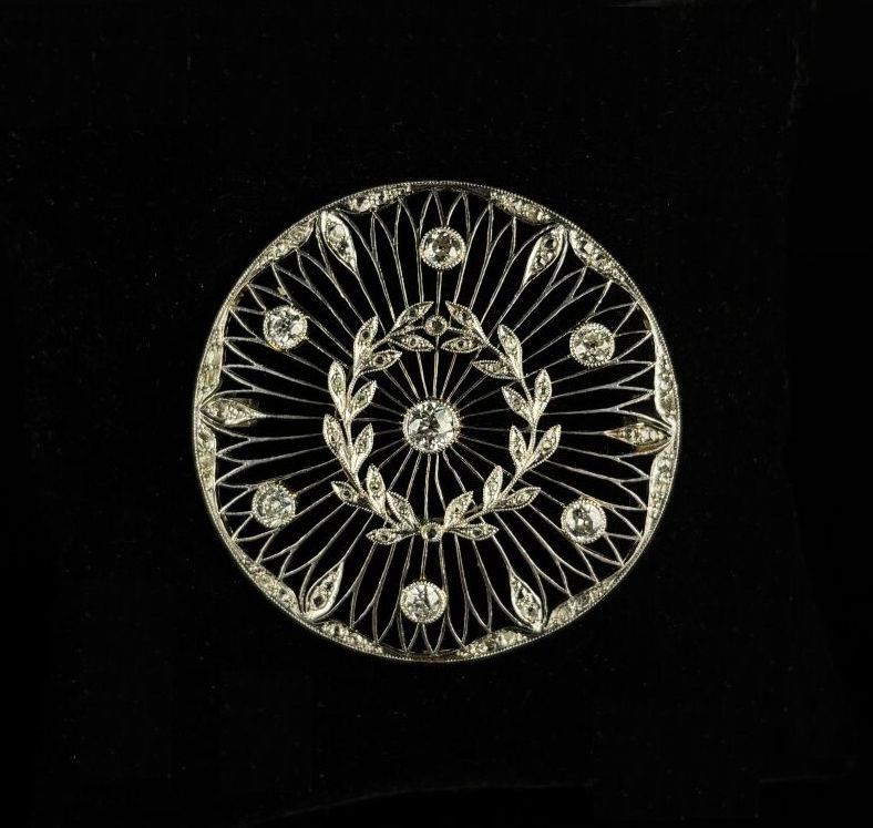 Circular openwork brooch in white gold featuring a crown of leaves motif.