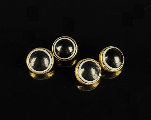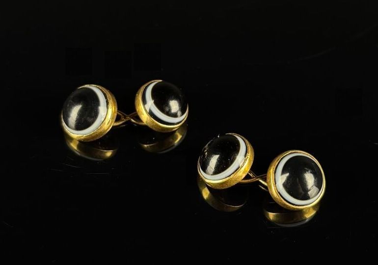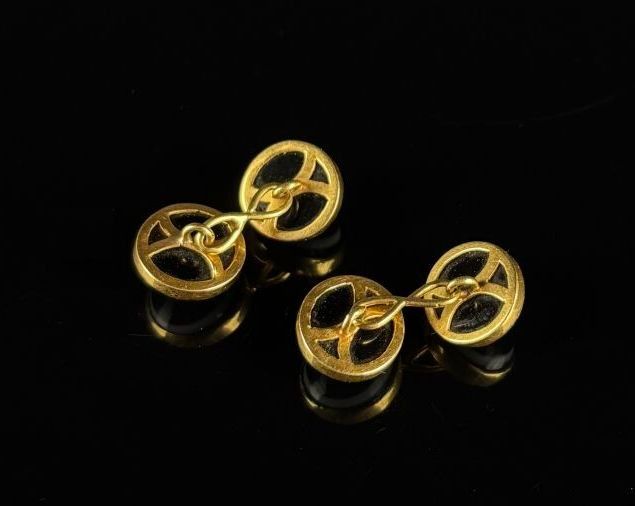 Pair of yellow gold cufflinks set with circular onyx cabocho…
