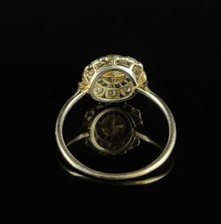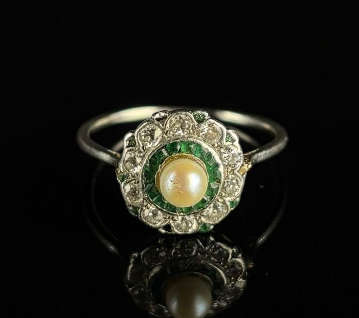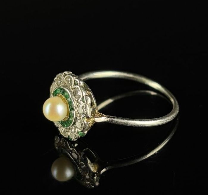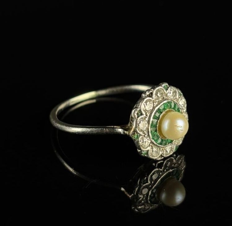 White gold ring set with a pearl surrounded by emeralds and diamonds.