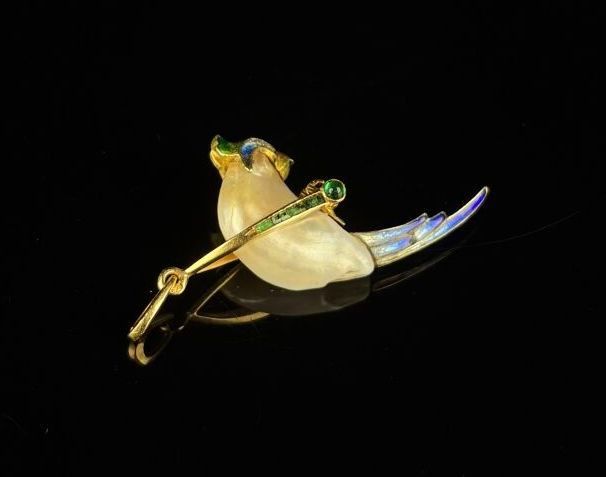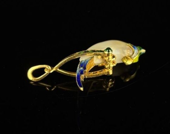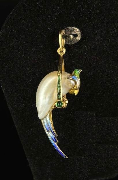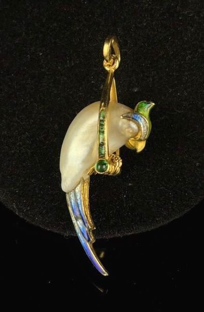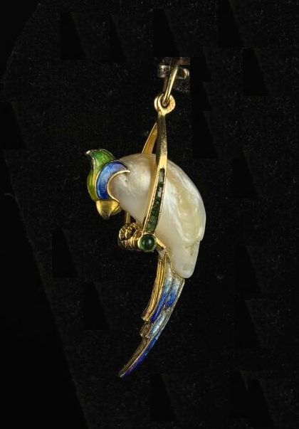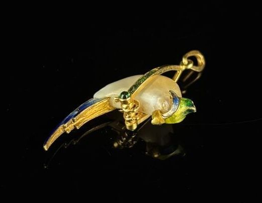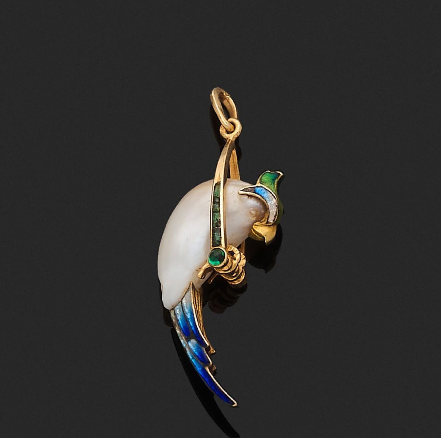The bird is composed of a sculpted baroque pearl forming the body, head and tail in polychrome enamelled gold.