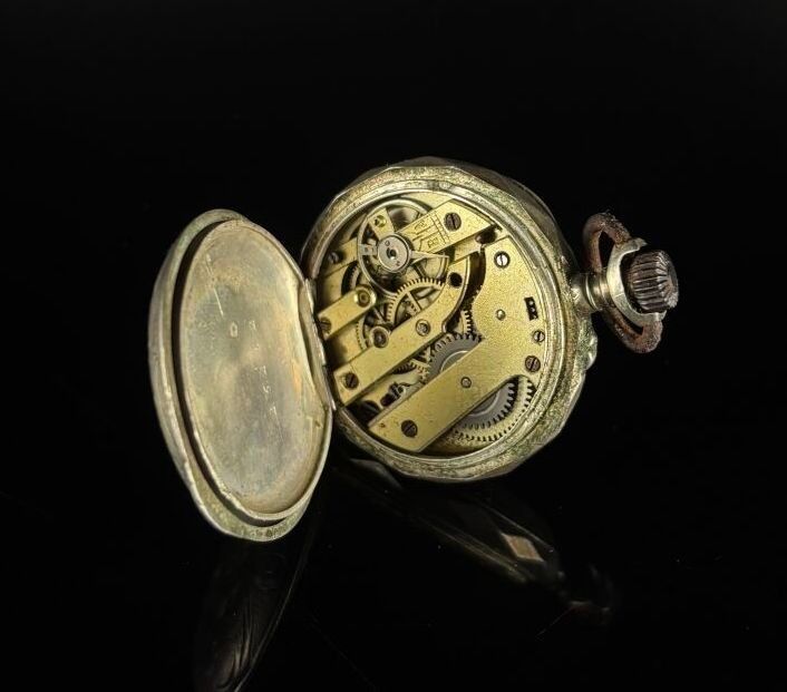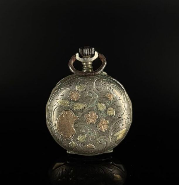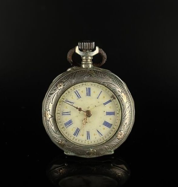 Silver and vermeil collar watch with plant decoration and silver dust cover.