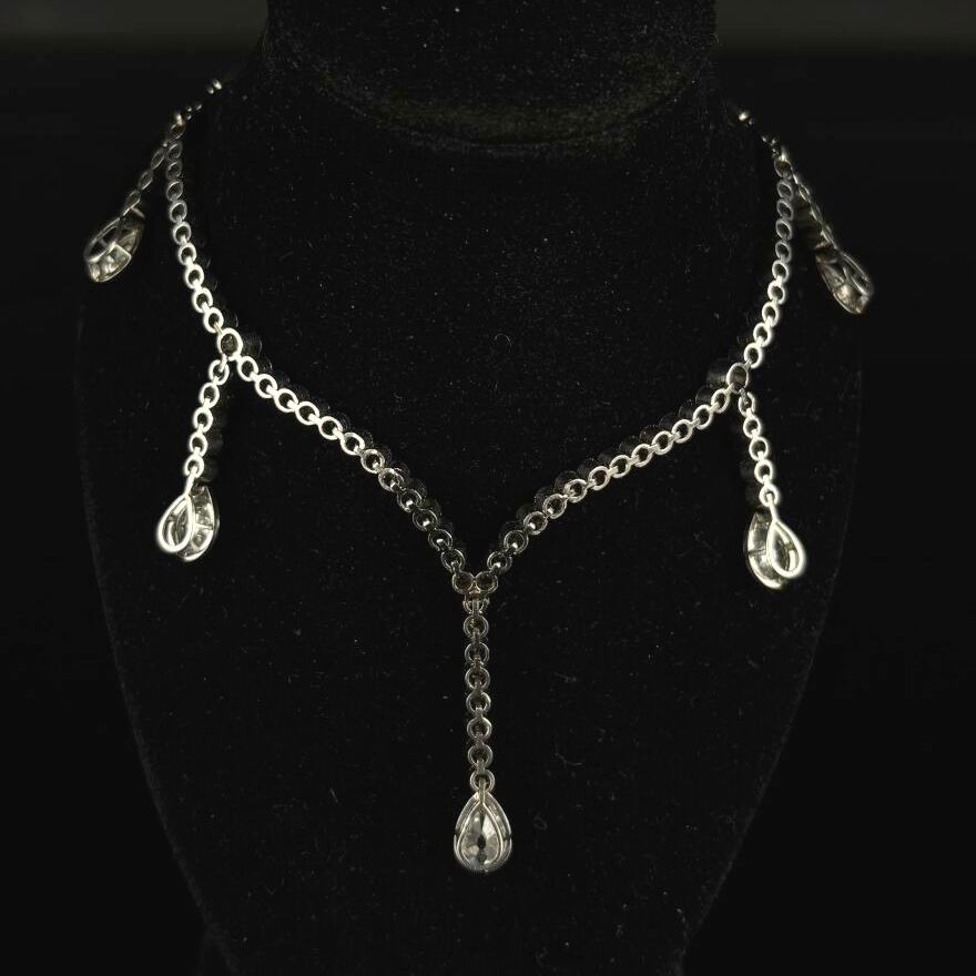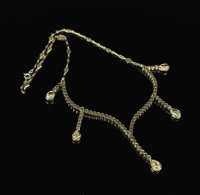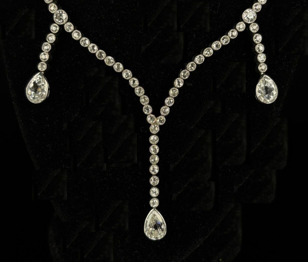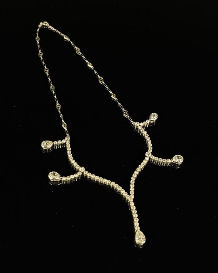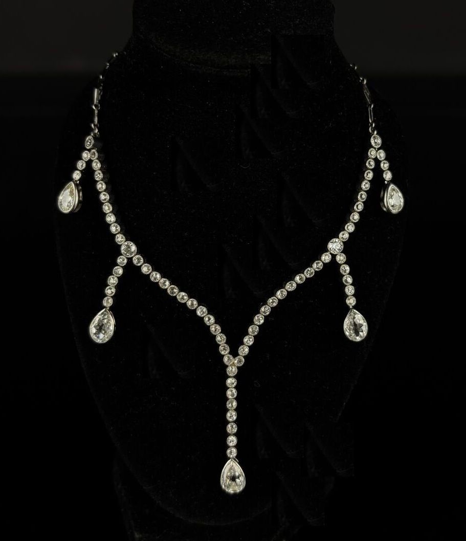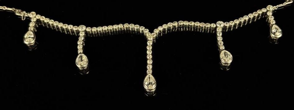 Platinum necklace comprising seventy-seven old-cut diamonds forming five pendants terminating in pear-cut diamonds.