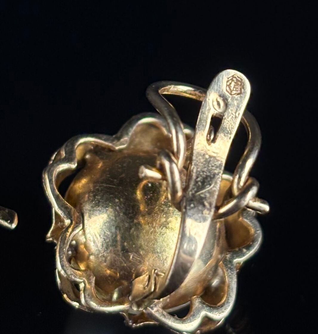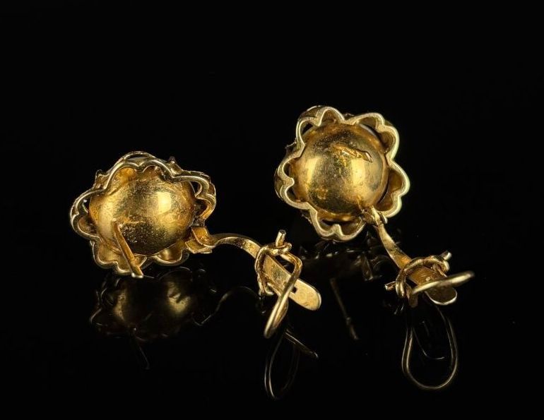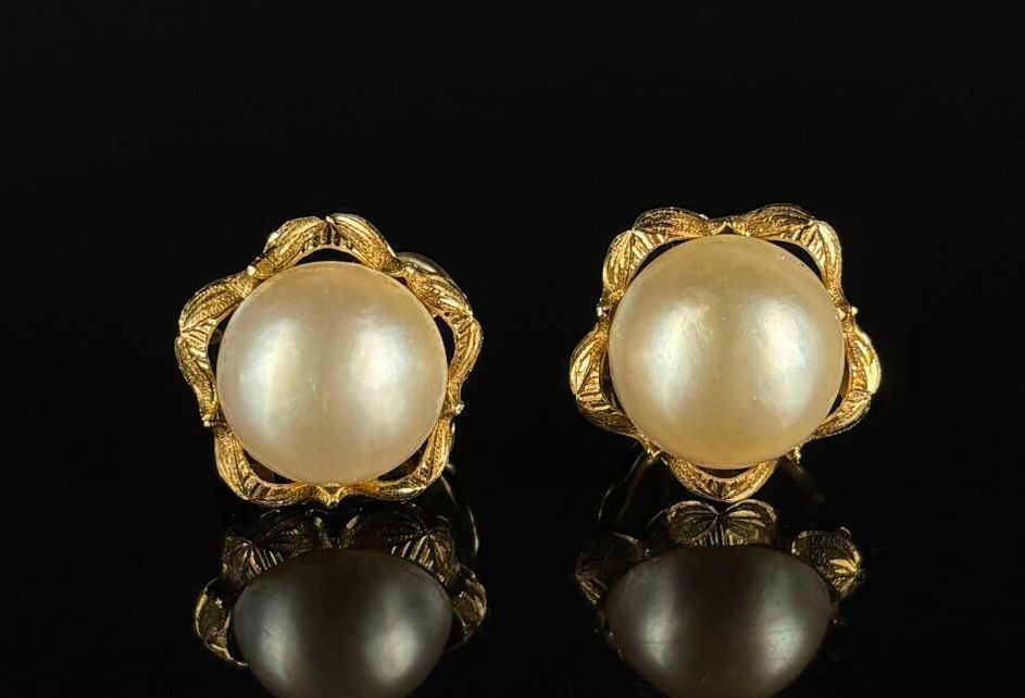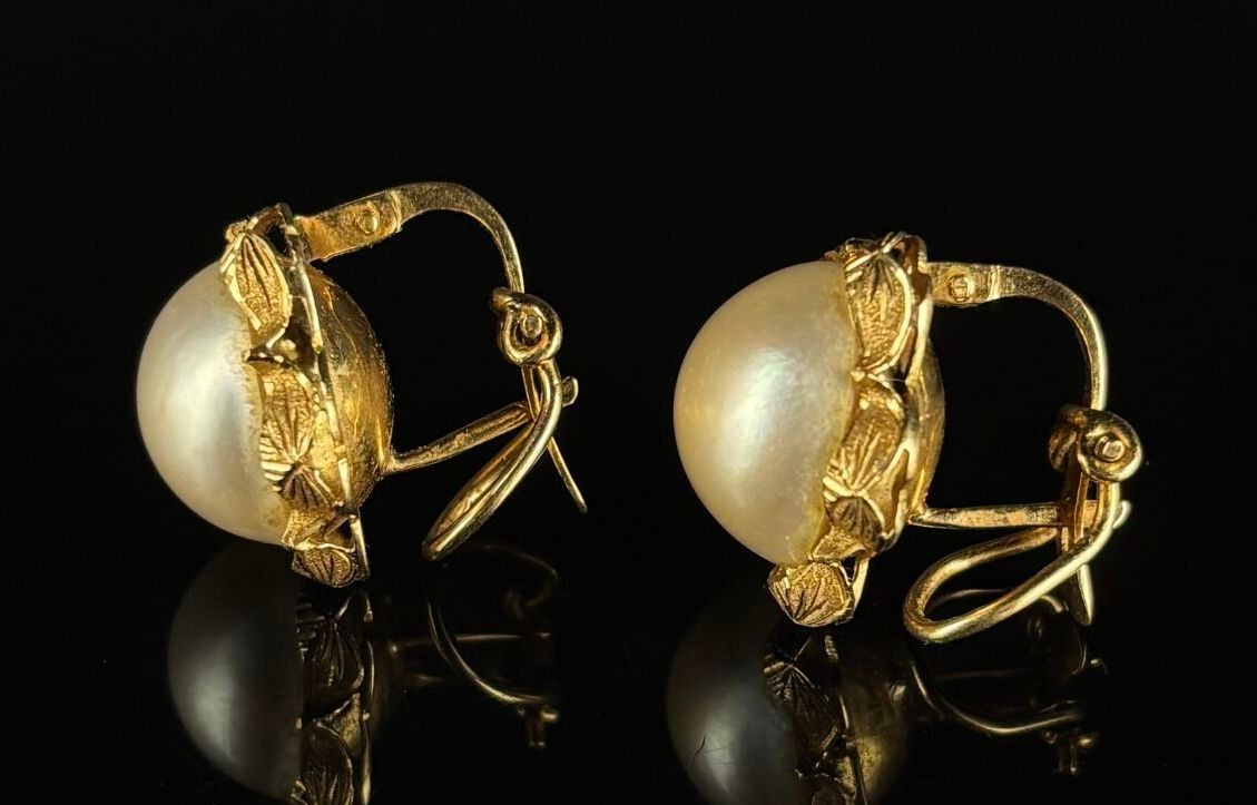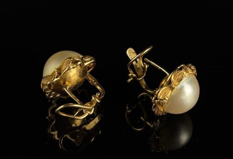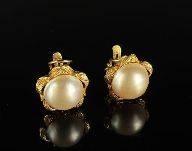 Pair of ear clips in yellow gold adorned with a mabé pearl.