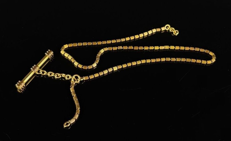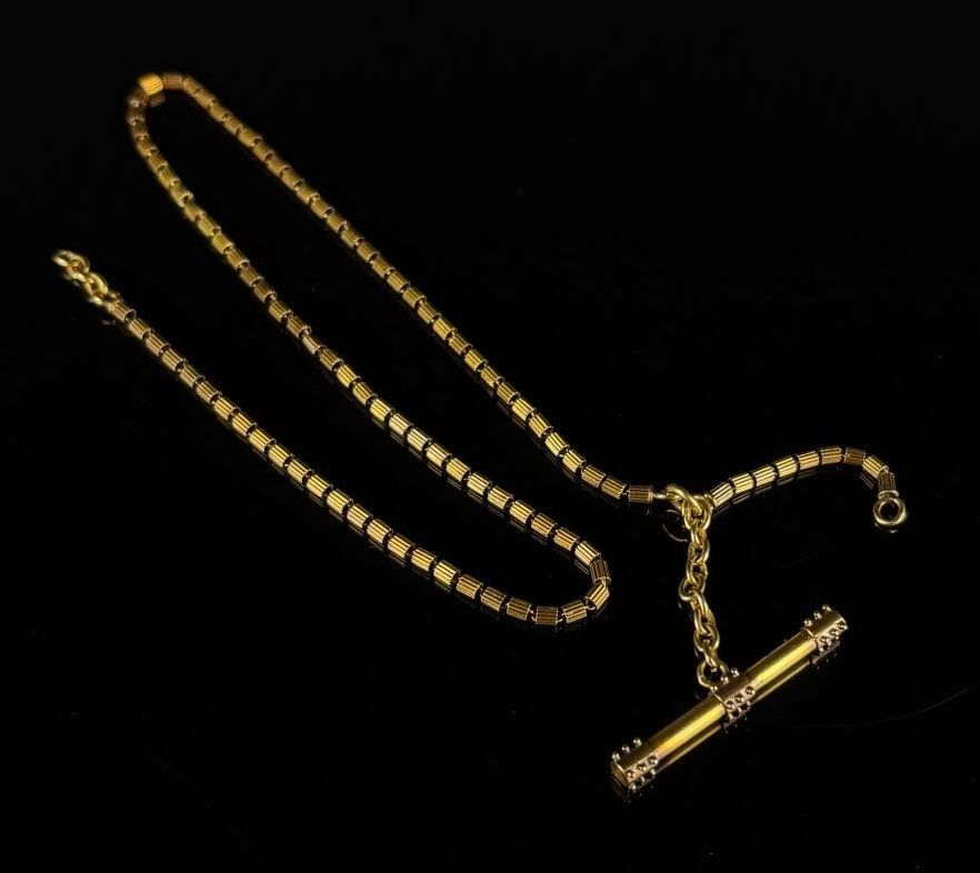 Yellow gold watch chain with striated cylindrical links, to which is attached a gold stem set with small pearls.