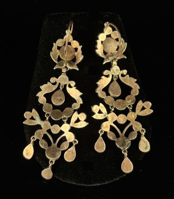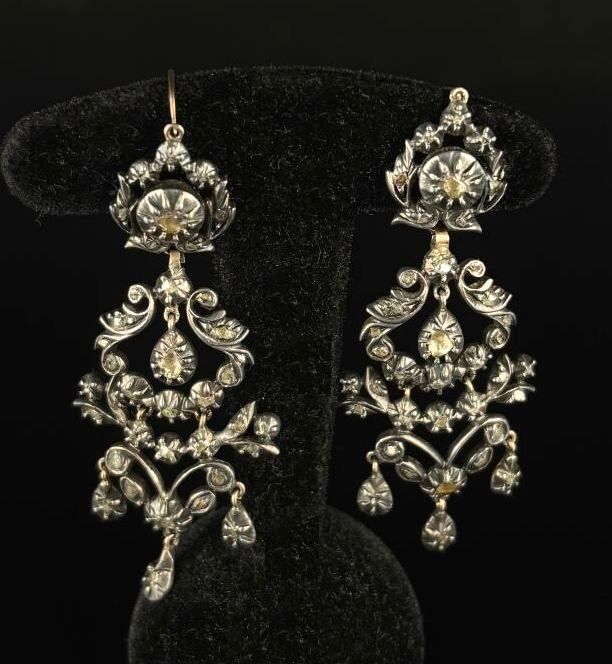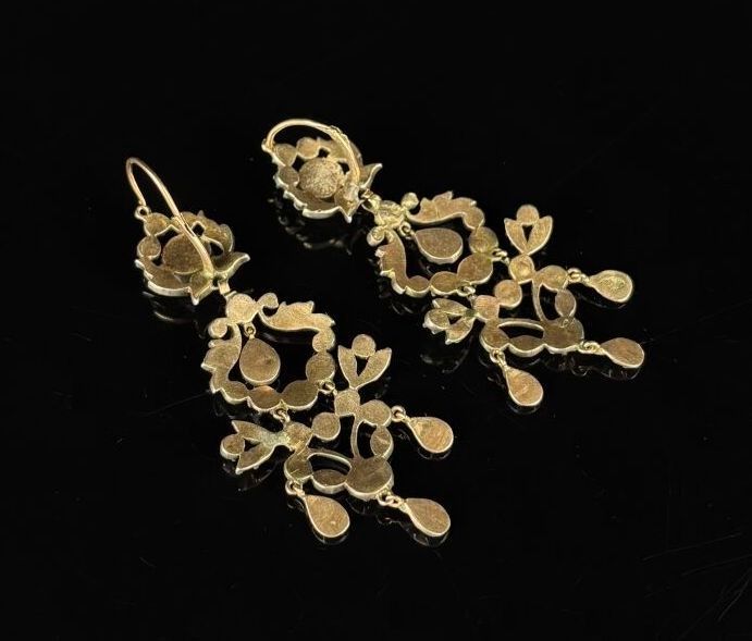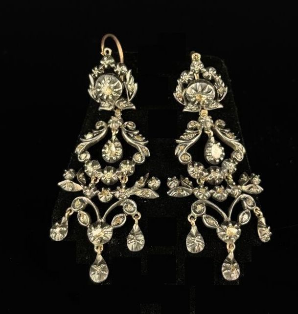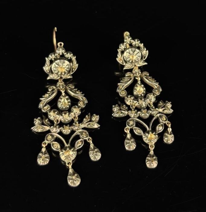 Pair of rose gold and silver earrings with plant decoration, set with rose-cut diamonds.