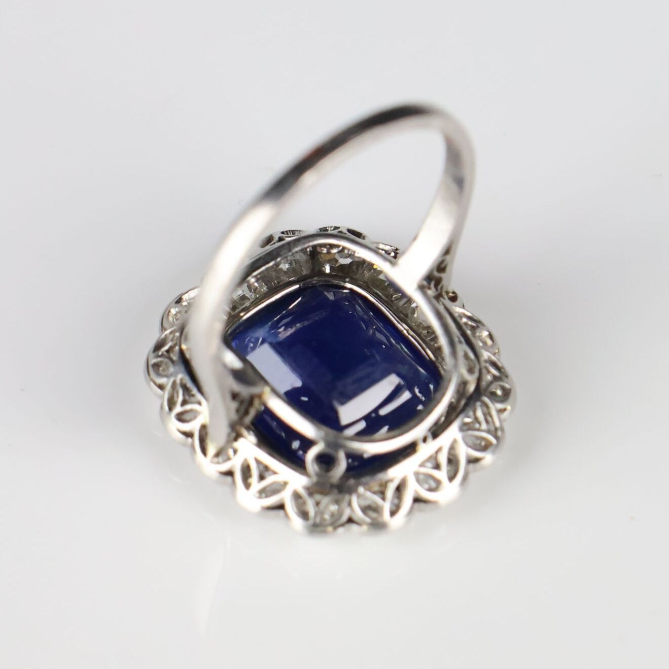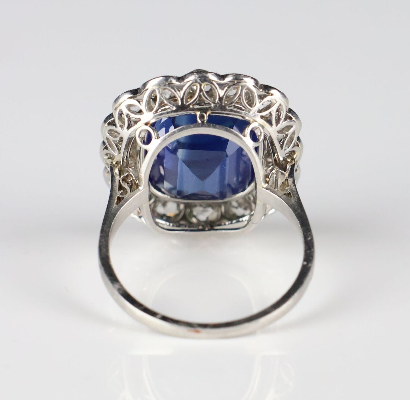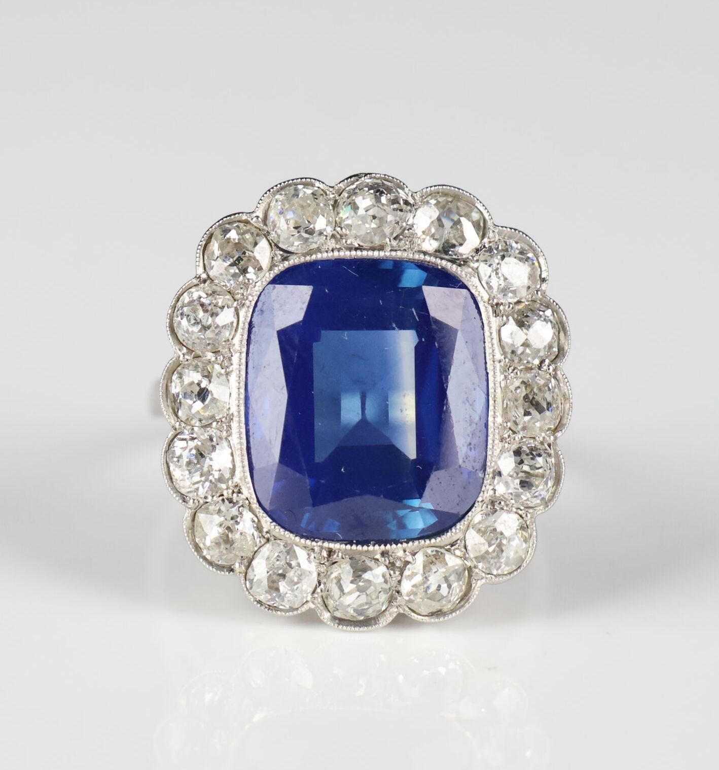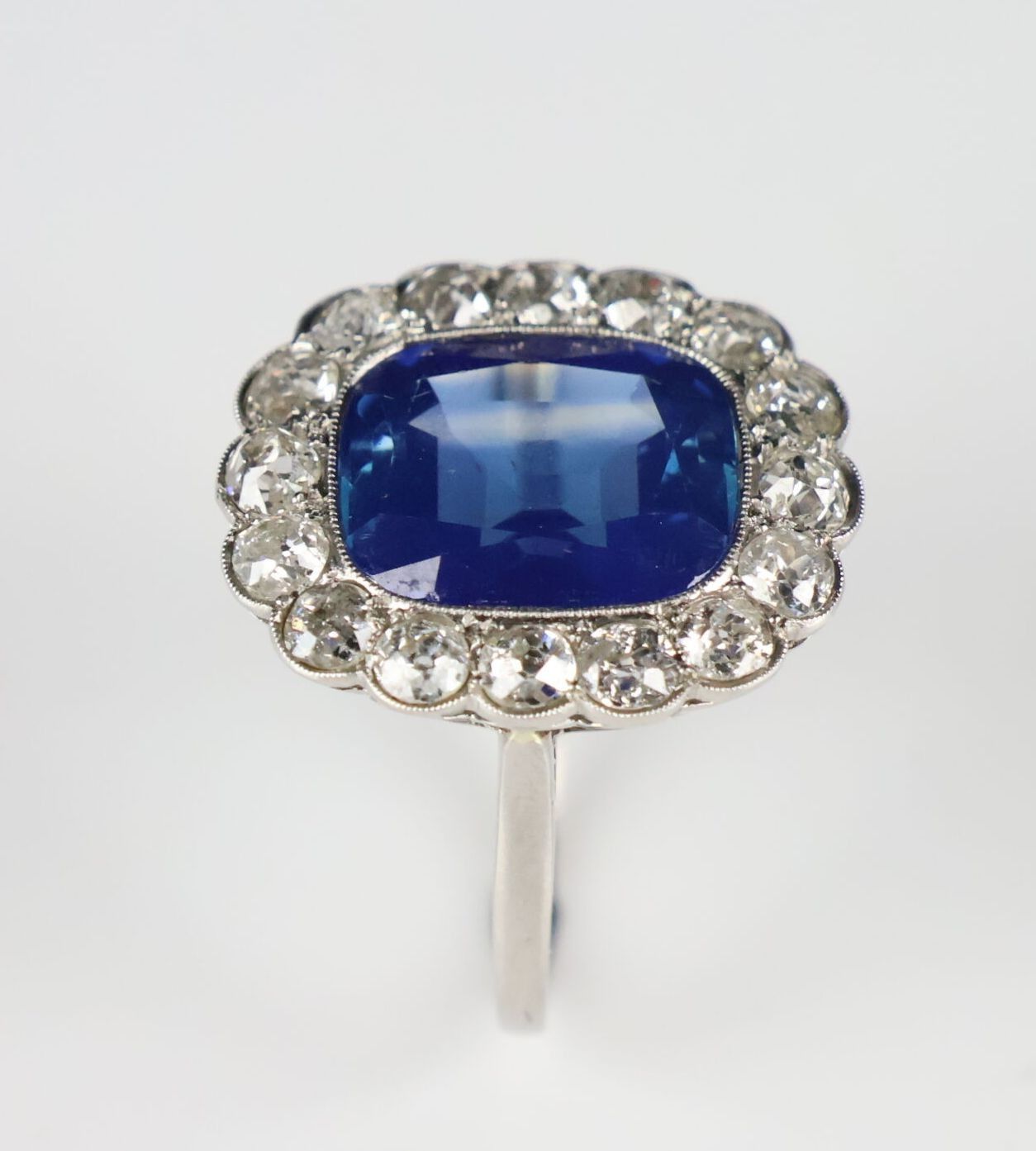 White gold ring set with an unheated Ceylon cushion-cut sapphire, weighing approximately 7.5 carats, surrounded by sixteen round old-cut diamonds.