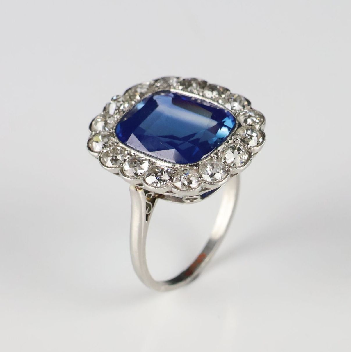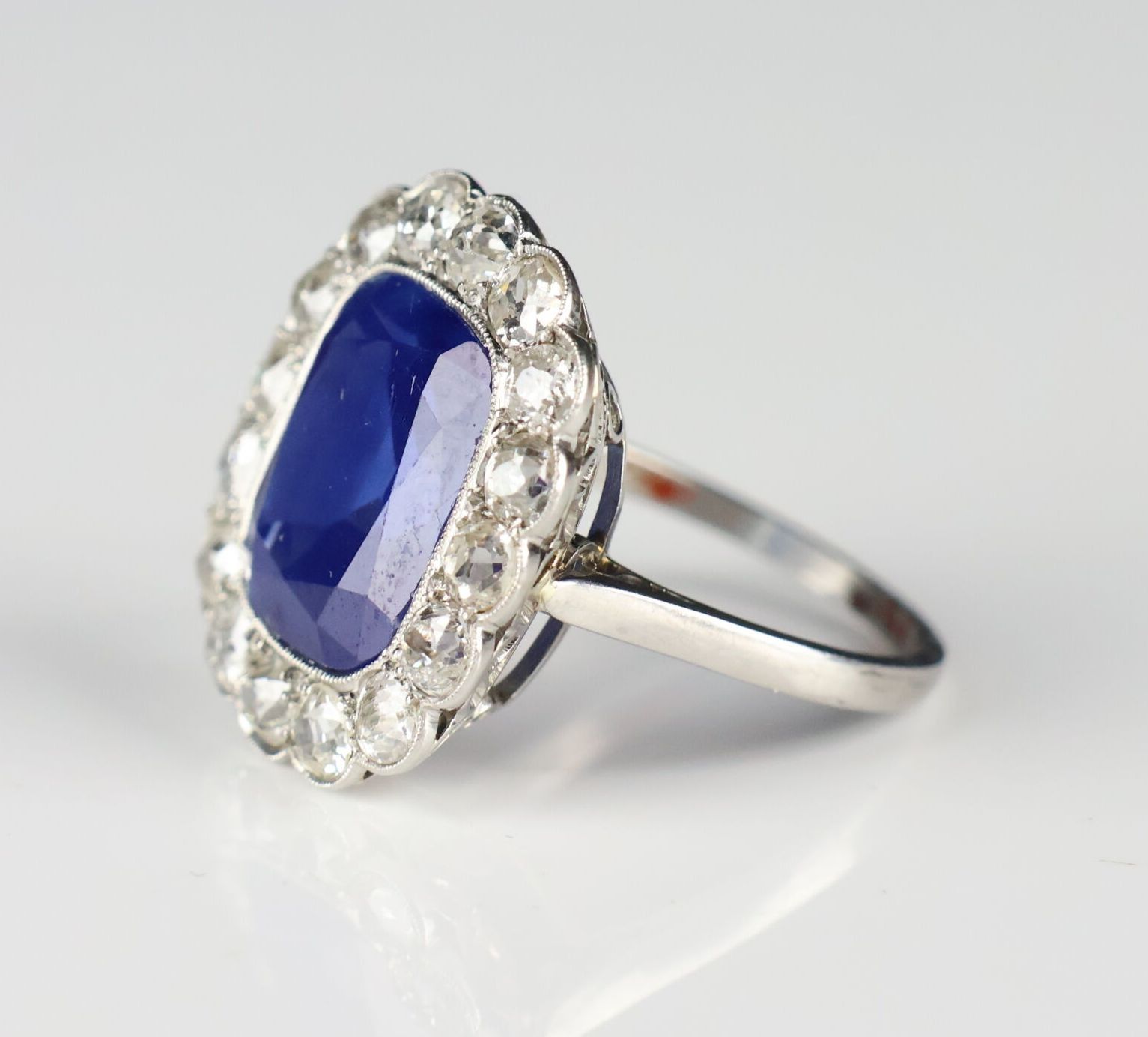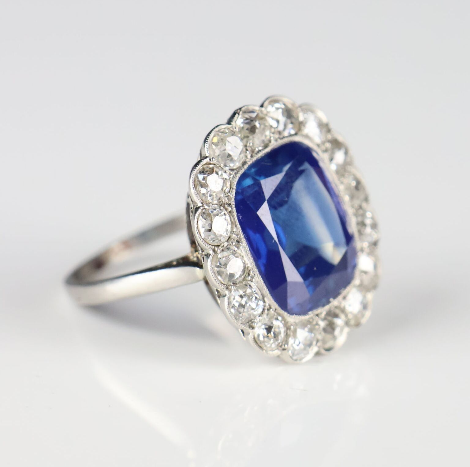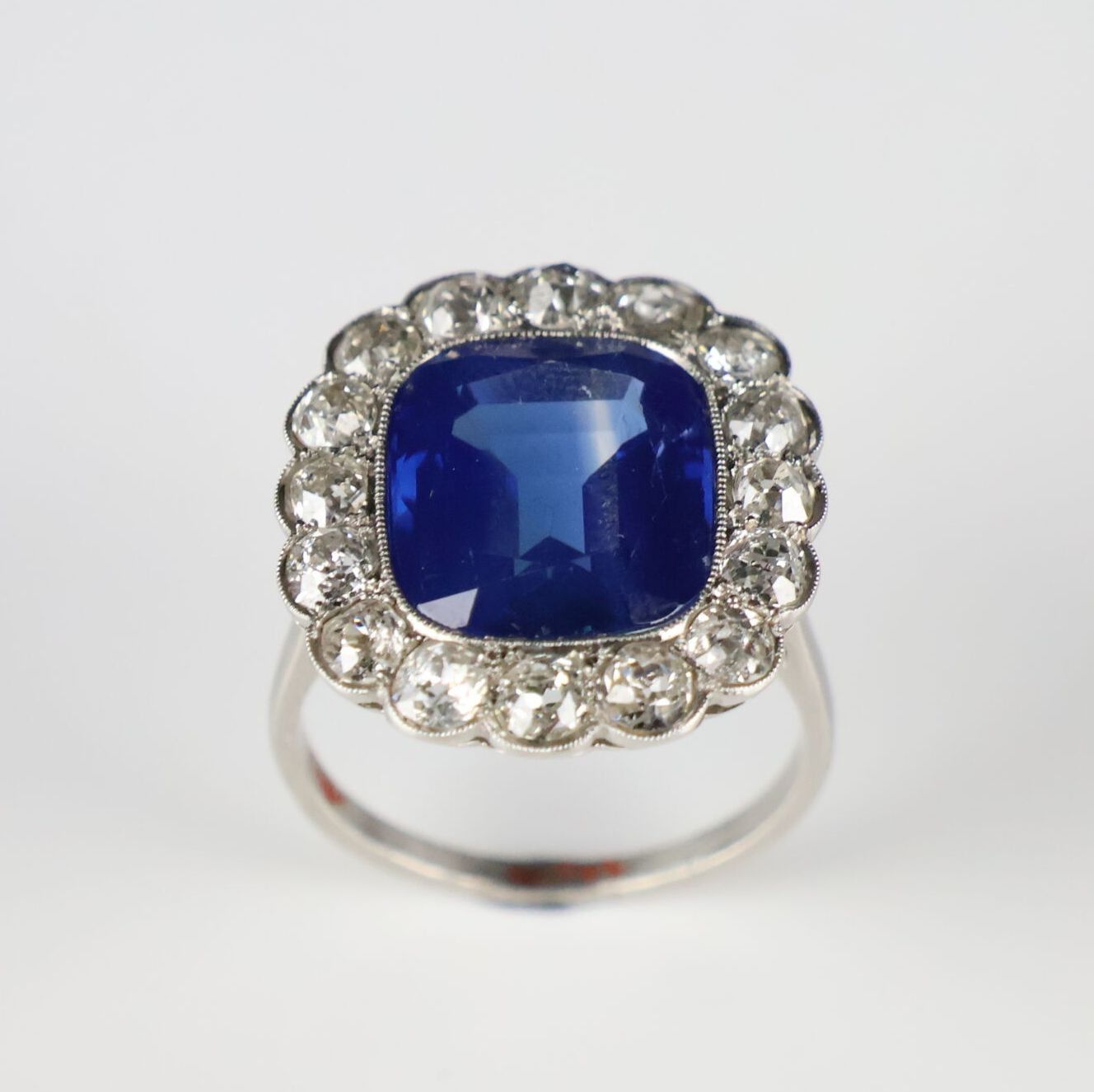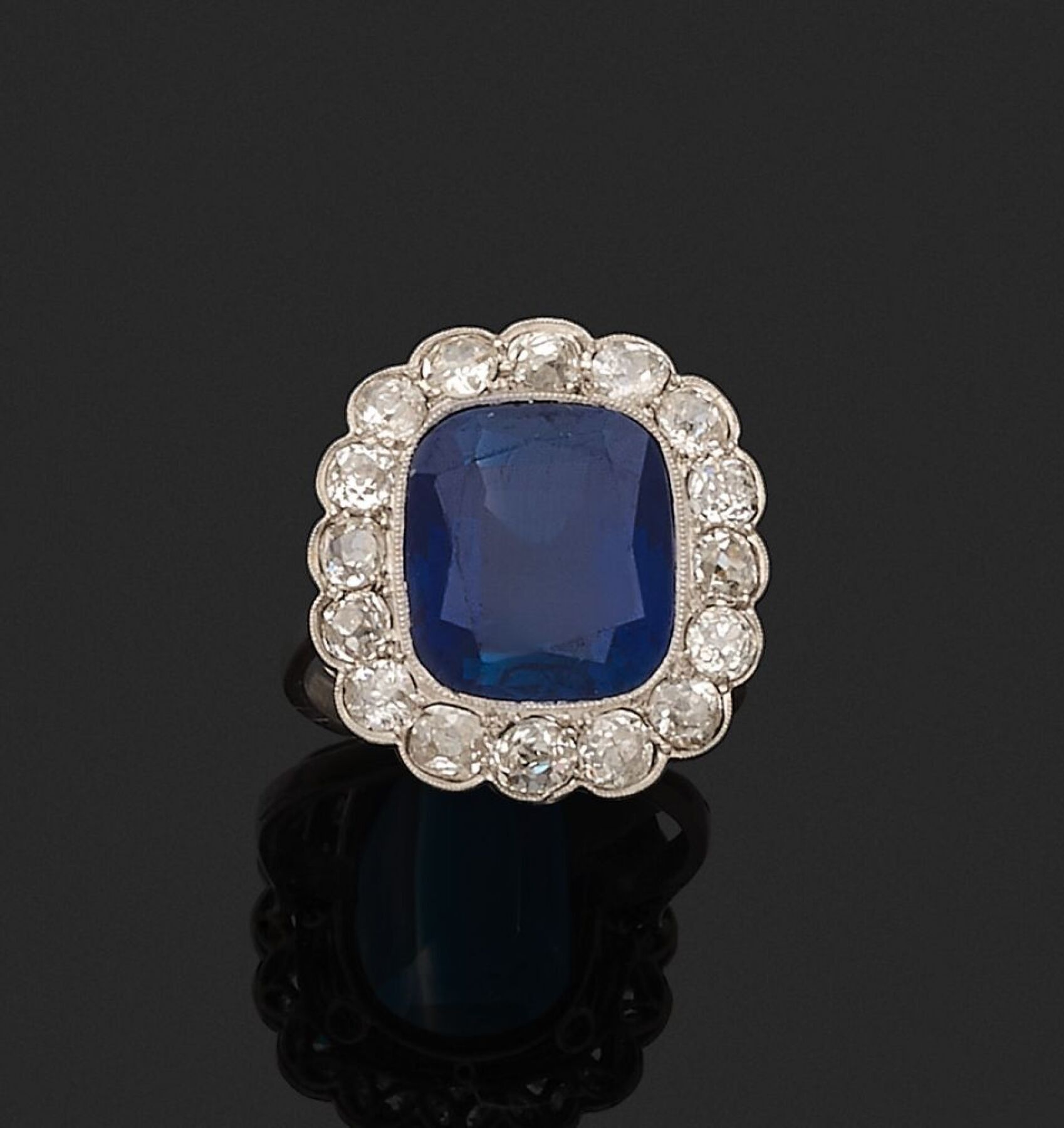 White gold ring set with an unheated Ceylon cushion-cut sapphire, weighing approximately 7.5 carats, surrounded by sixteen round old-cut diamonds.