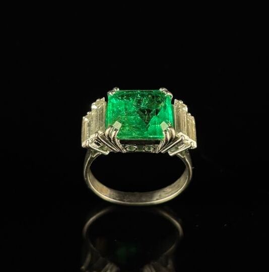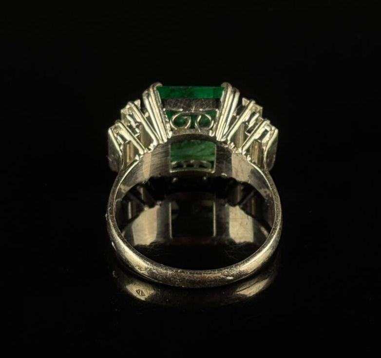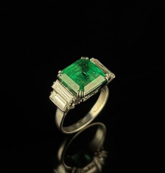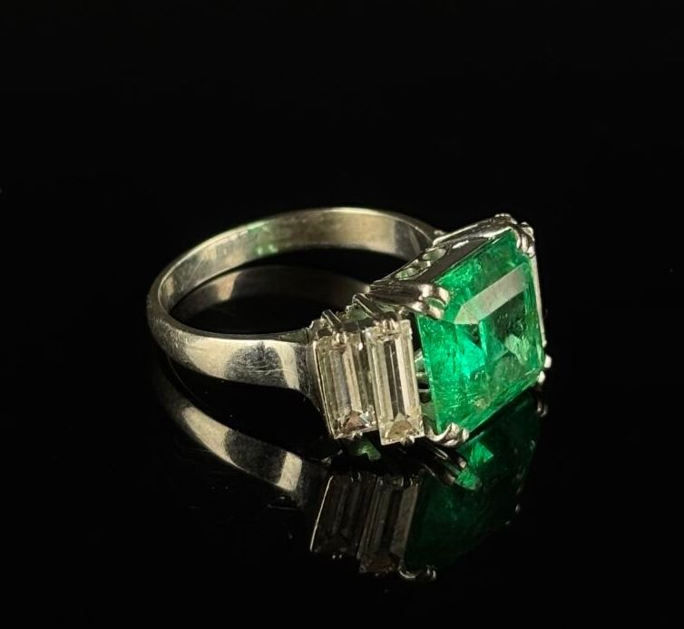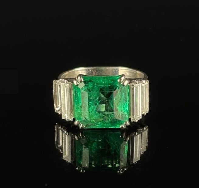White gold ring set with a square-cut Colombian emerald weig…