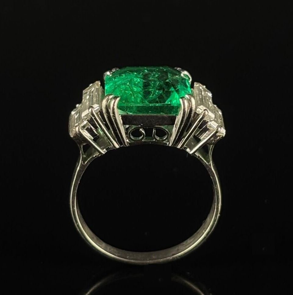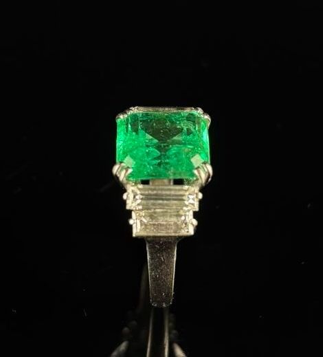 White gold ring set with a square-cut Colombian emerald weighing approximately 4.4 carats.