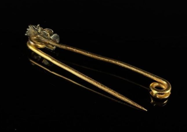 Yellow gold and silver pin showing a gallinaceous head ename…