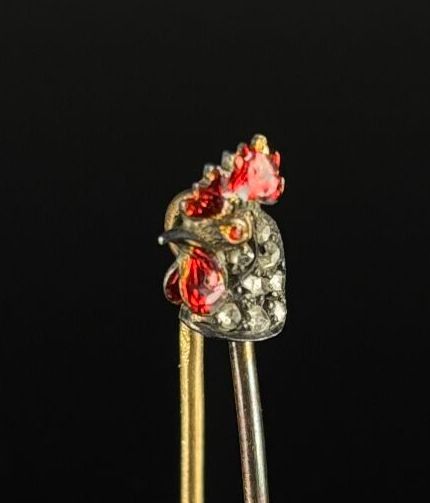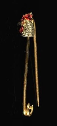 Yellow gold and silver pin showing a gallinaceous head enamelled red and set with rose-cut diamonds.