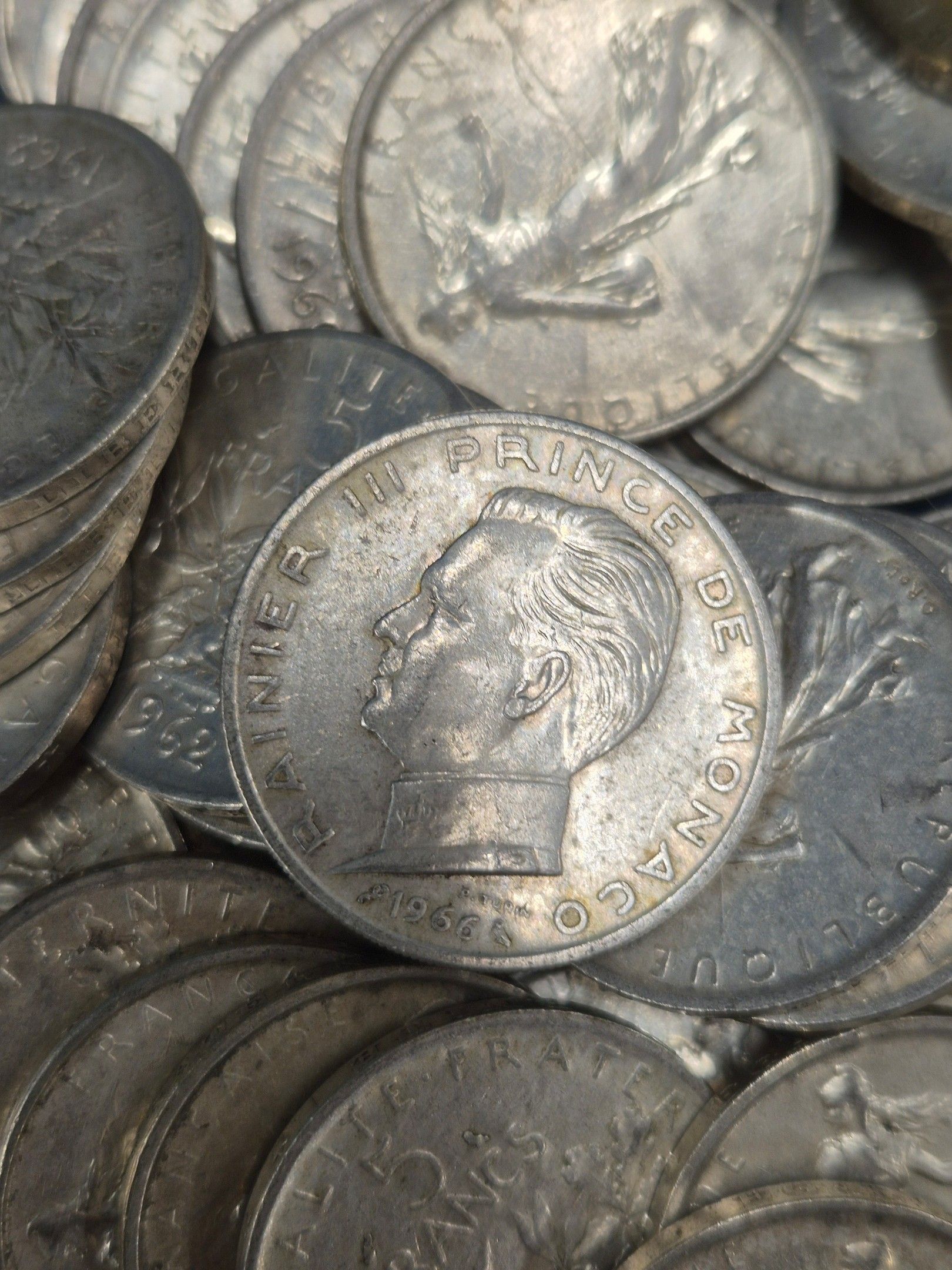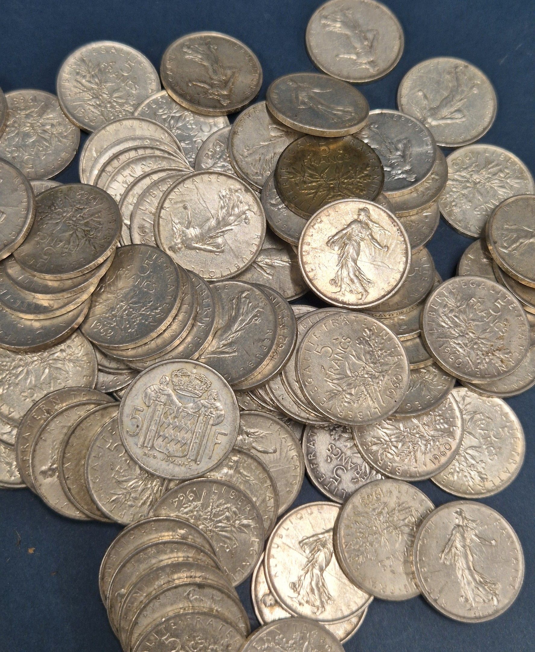Lot of 98 5-franc coins Semeuse in silver 835 thousandths and 1 5-franc coin MONACO 1966 Rainier III.