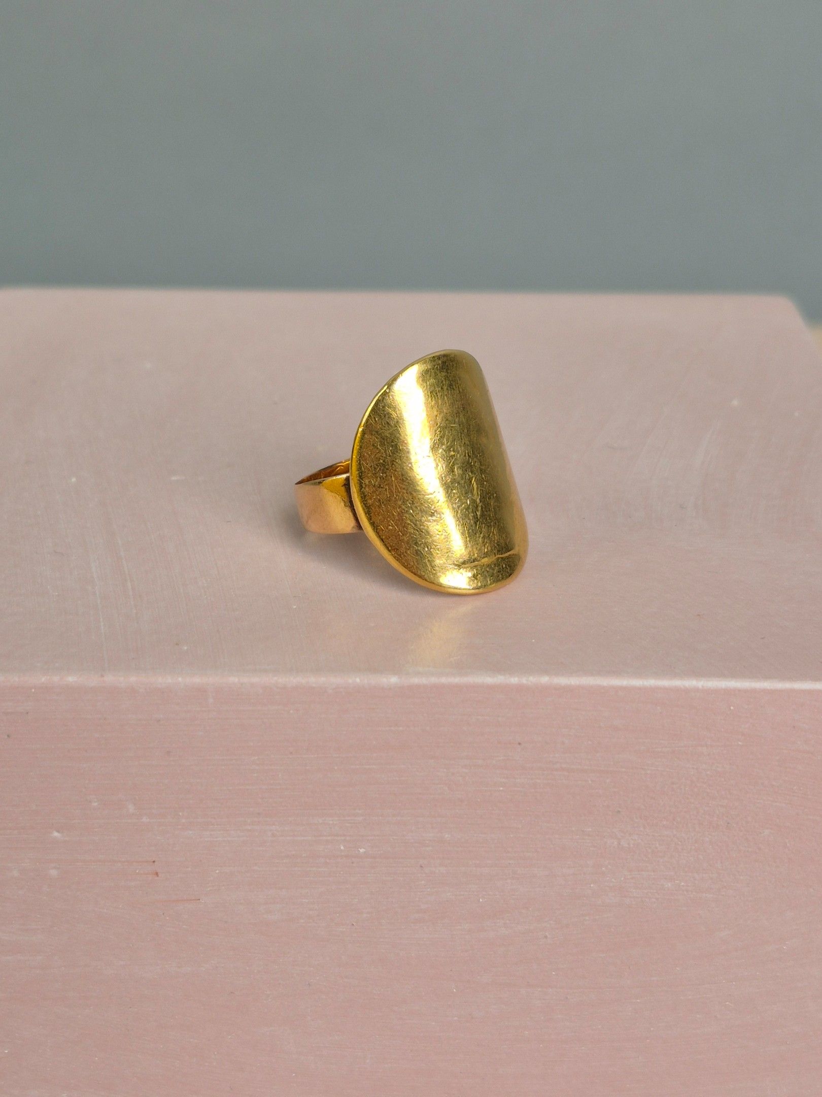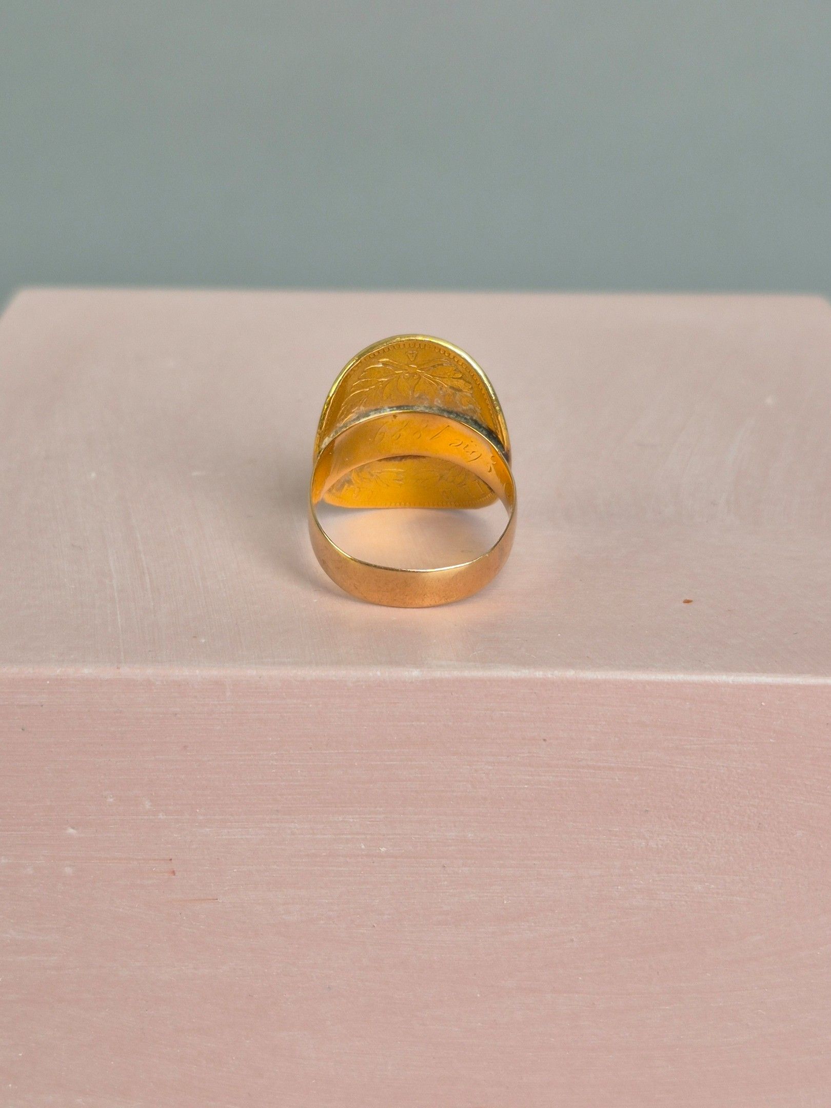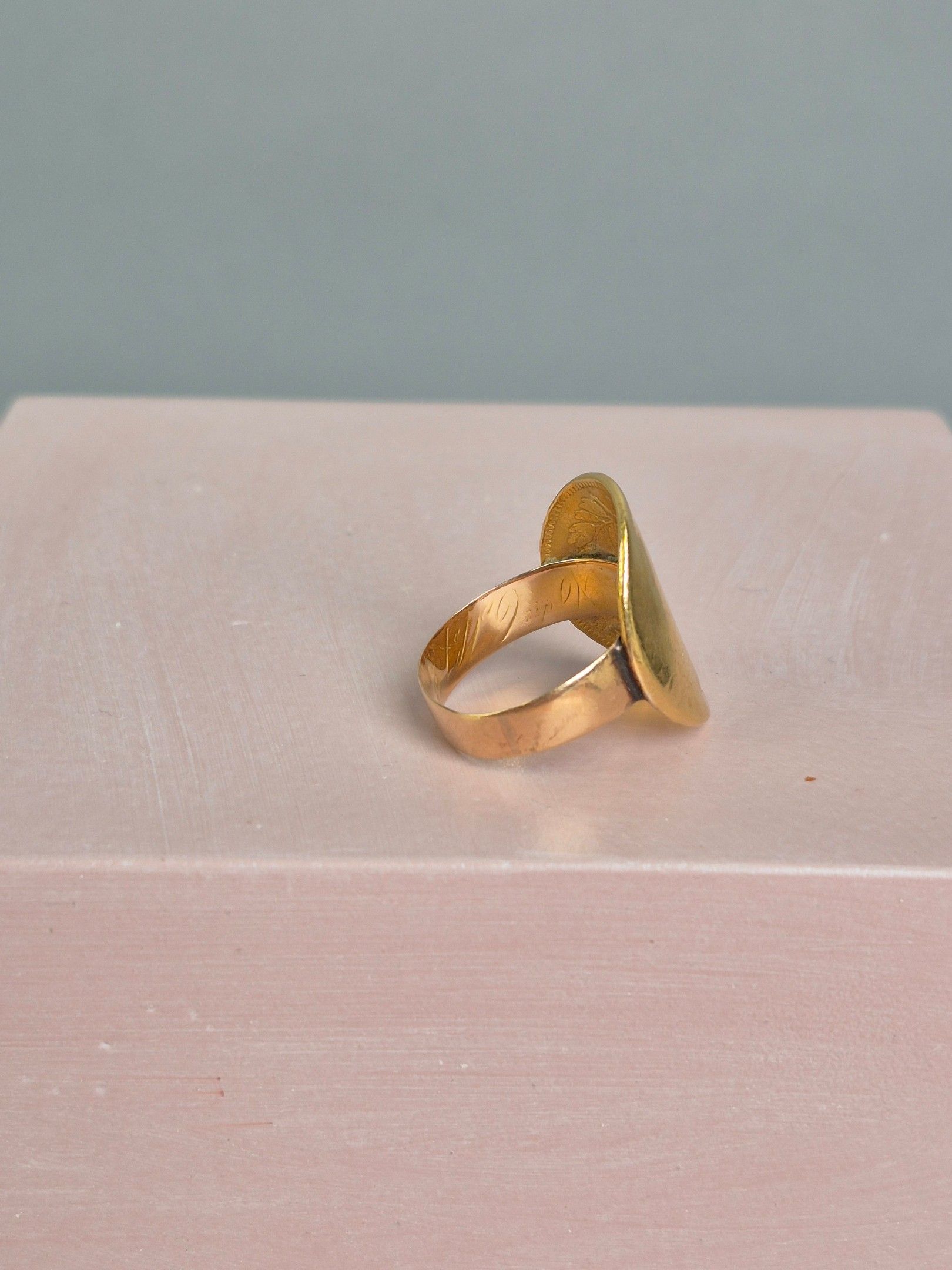18k 750 thousandth yellow and pink gold ring set with a turned and surface-polished coin (probably a 20-franc gold coin), engraved on the inside of the ring.