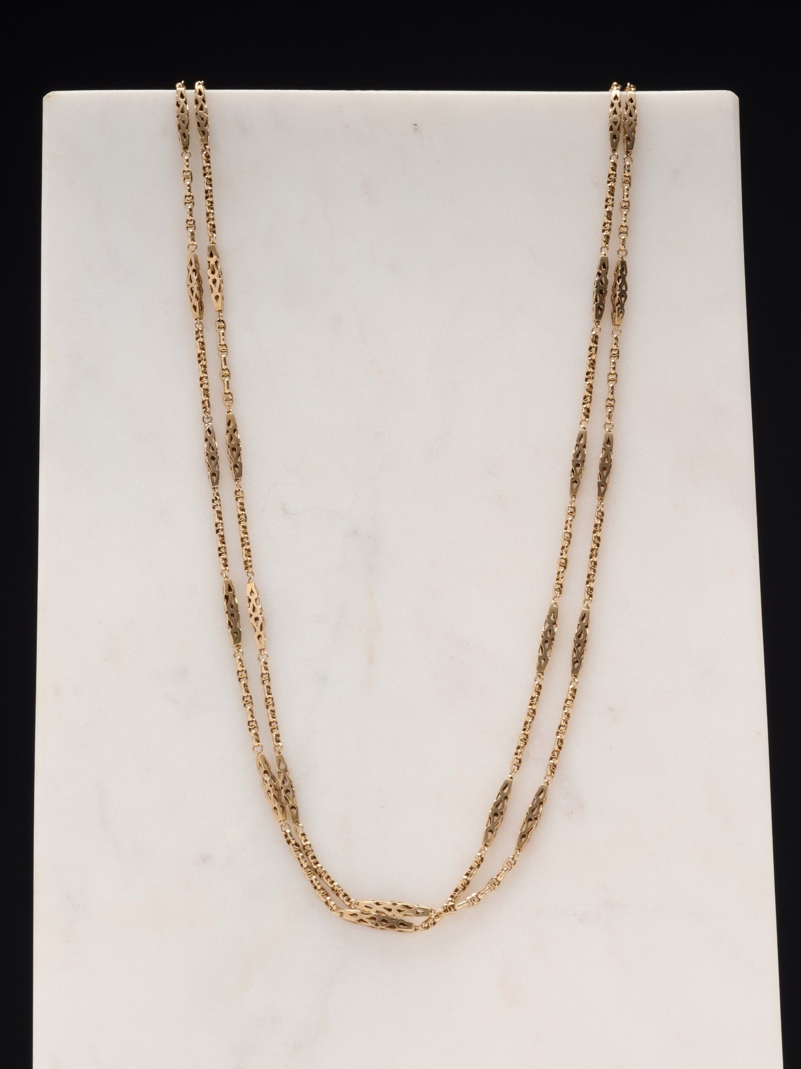 9k 375 thousandths yellow gold waistcoat chain that can be worn as a long necklace, alternating double Breguet links and an openwork diamond pattern of water drops.