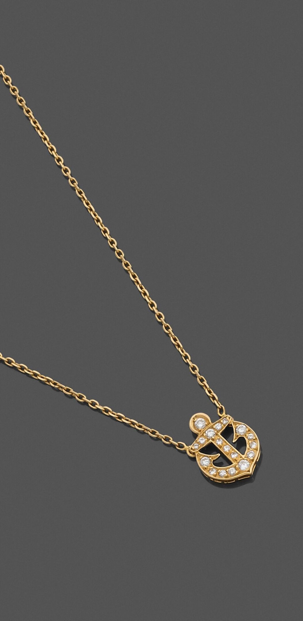 Articulated necklace in 750 thousandths yellow gold holding in the centre a "marine anchor" motif set with small round brilliant-cut diamonds.