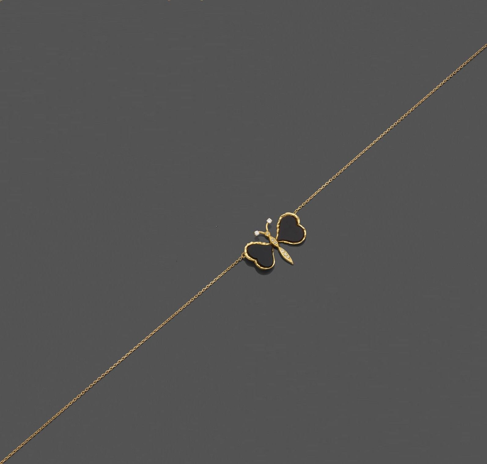 Articulated necklace in 750 thousandths yellow gold holding a butterfly as a pendant, the wings adorned with onyx, the body set with diamonds. (Wear). Length: 37.8 cm - Gross weight: 6.1 g