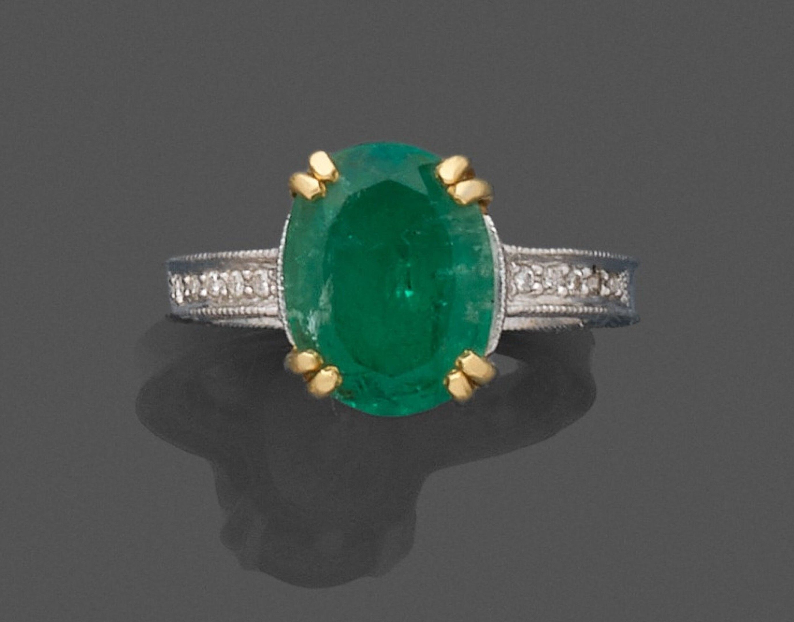 Ring in 750 thousandths gold and 850 thousandths platinum set in the centre with an oval emerald between two lines of round brilliant-cut diamonds. The basket and part of the ribs are also set with diamonds.