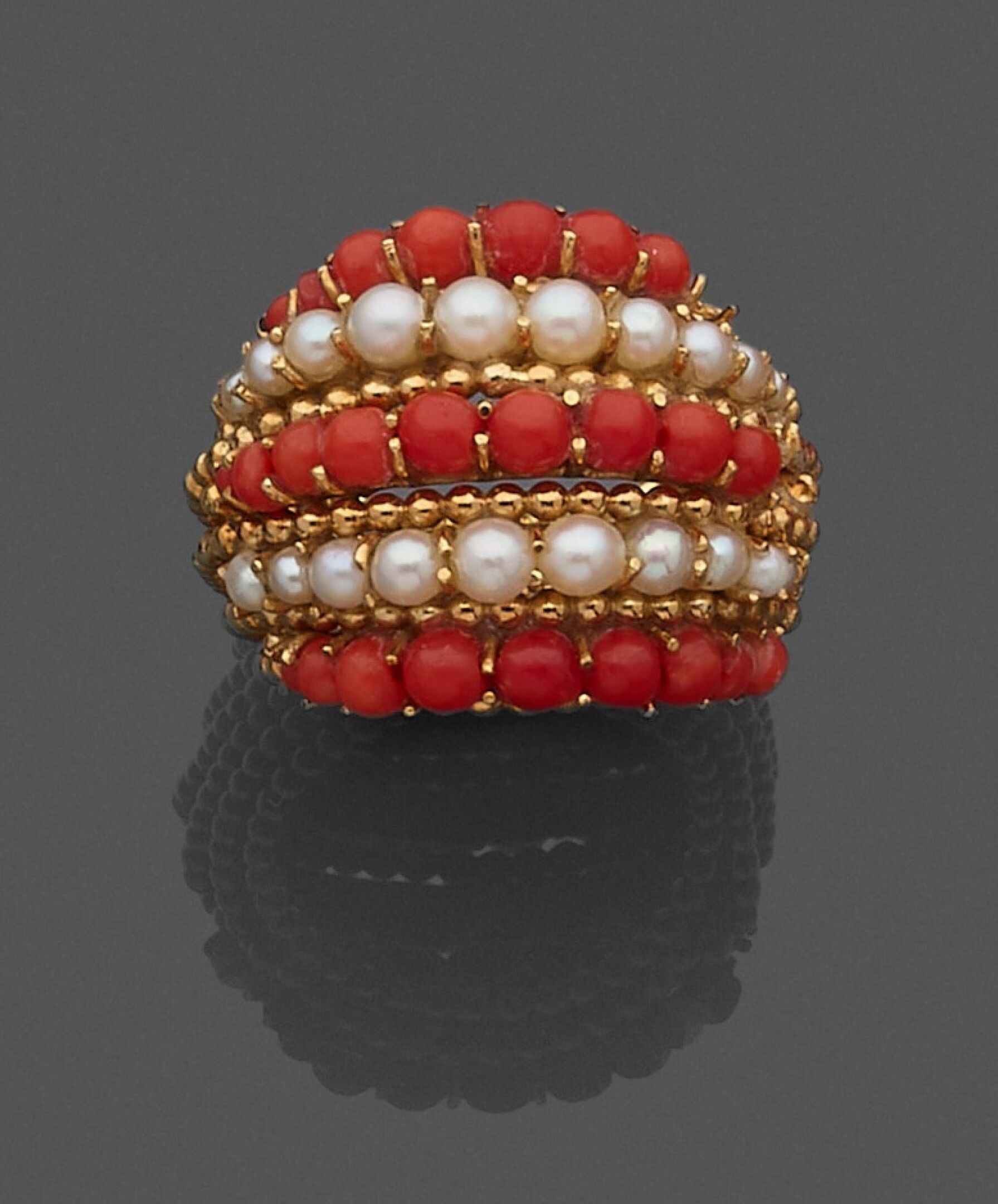 Ring in engraved 750 thousandths yellow gold decorated with gold balls, the centre adorned with lines of cultured pearls and coral balls (Corallium rubrum*), pierced.