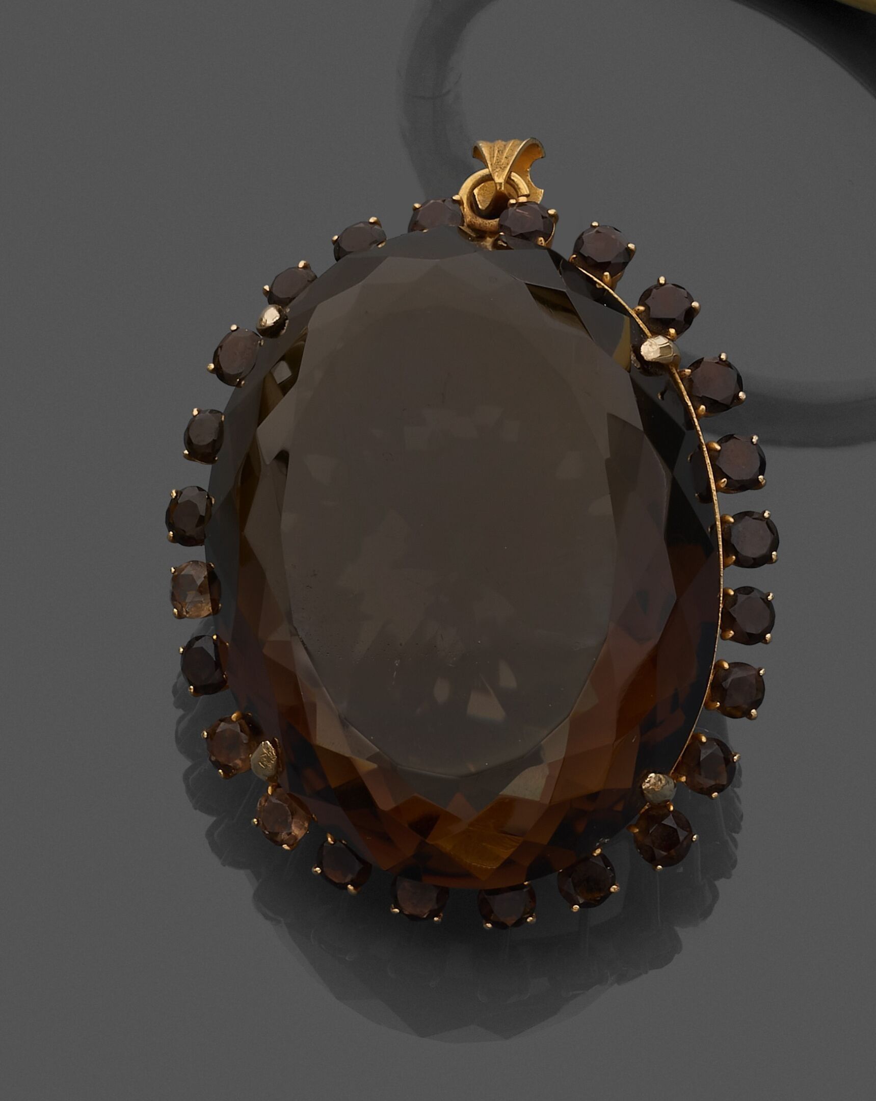 A large metal pendant with a central oval brown quartz set i…