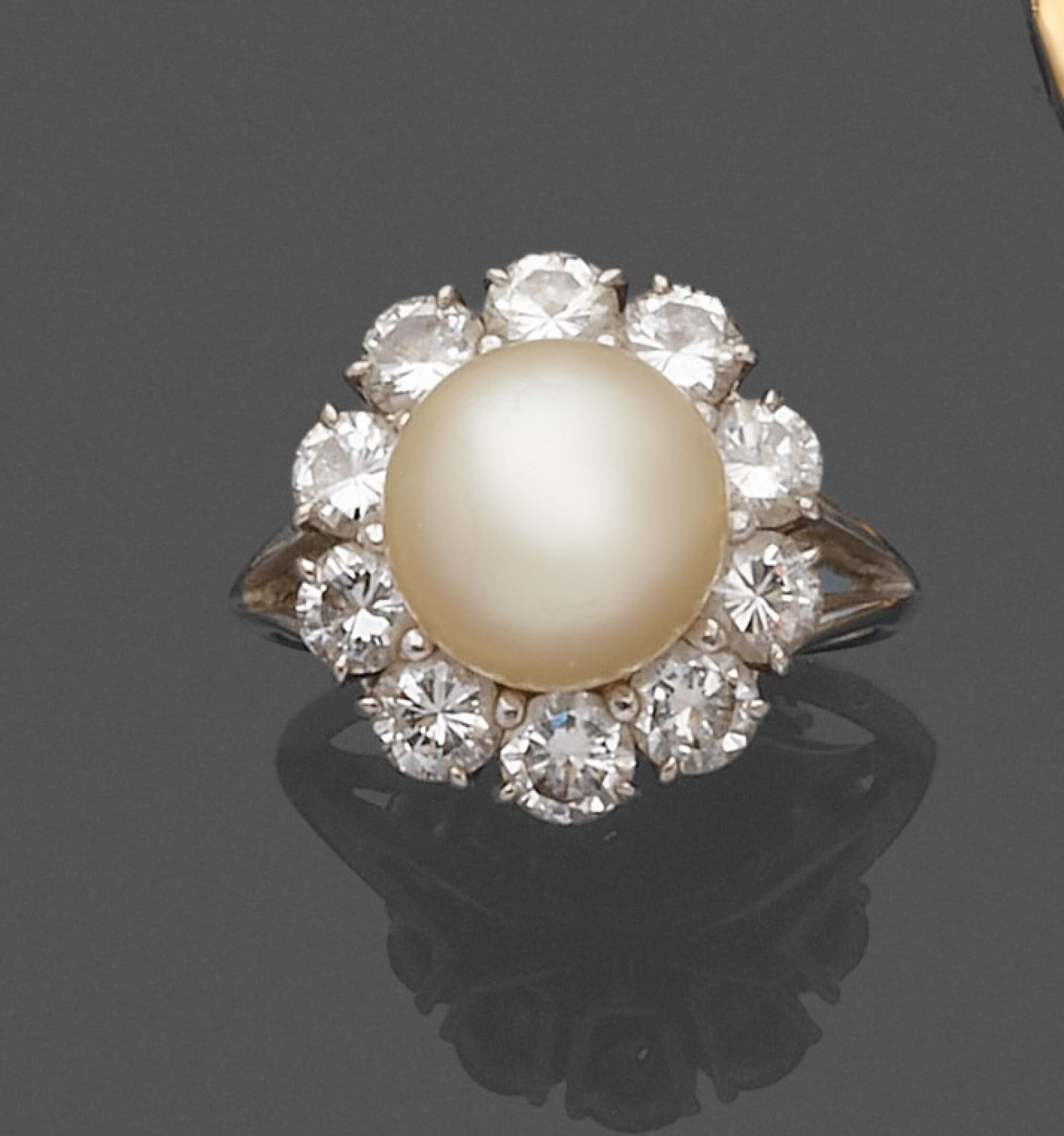 750 thousandths white gold ring with a central cultured pearl set in ten round brilliant-cut diamonds.