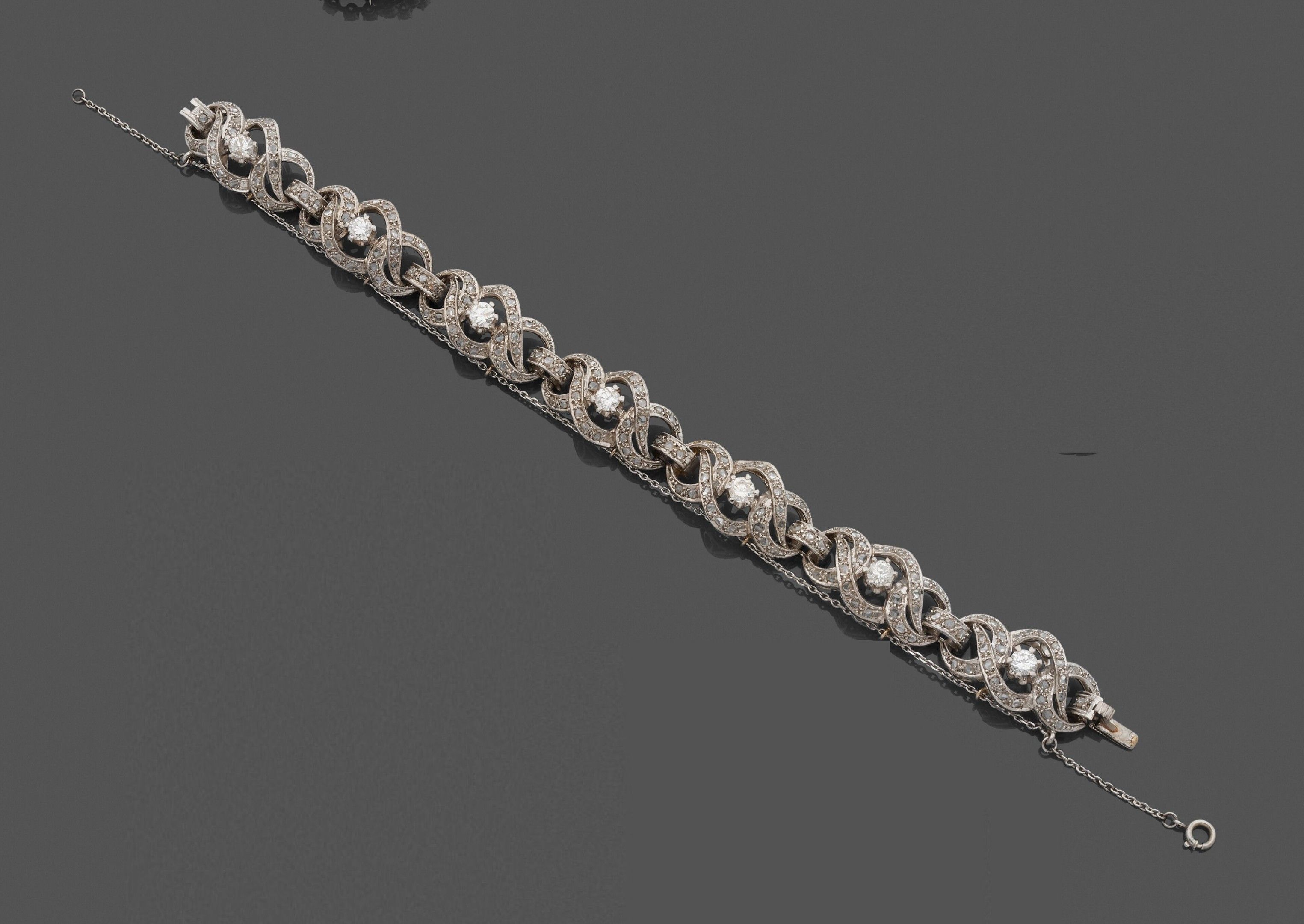 Articulated bracelet in 750 thousandths white gold, the links with a moving and interlaced design entirely set with rose-cut diamonds, the larger round brilliant-cut diamonds in the centre.