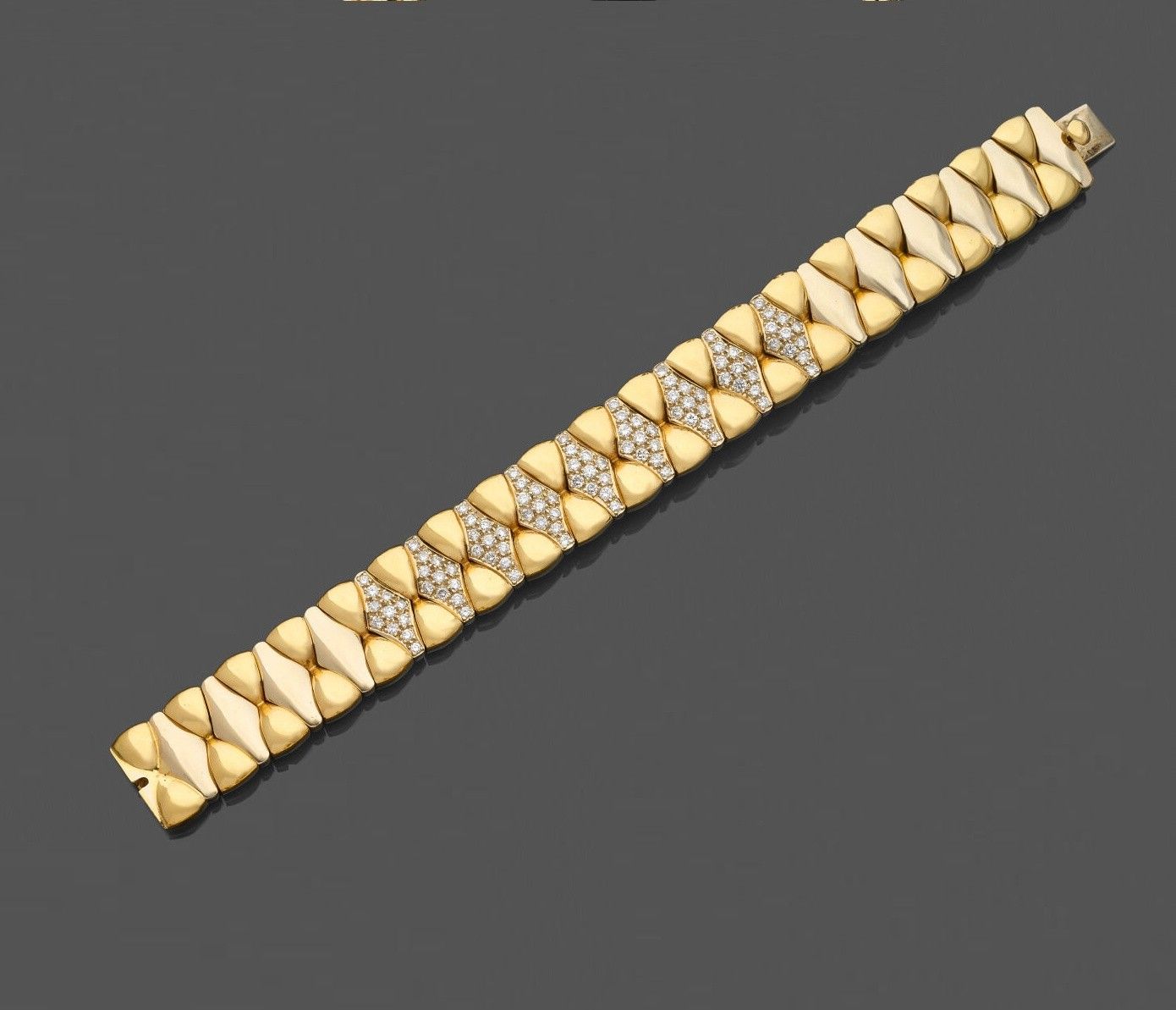 Articulated bracelet in 750 thousandths yellow gold, the links with geometric decoration, those in the centre paved with round brilliant-cut diamonds.