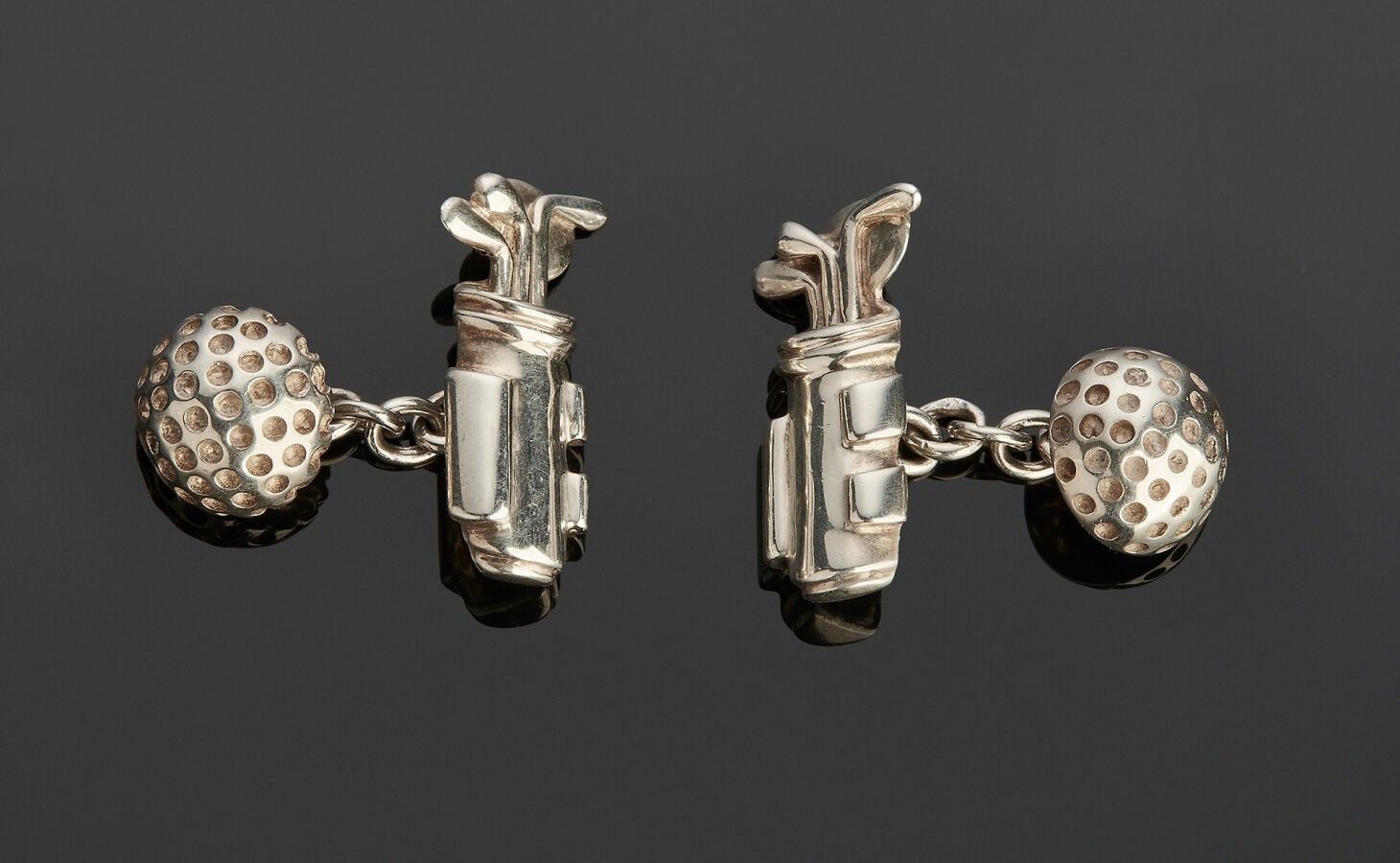 LINKS OF LONDON, circa 1997 - Pair of silver cufflinks (925 thousandths) featuring a golf ball and a caddie on the other. In a LINKS OF LONDON presentation case