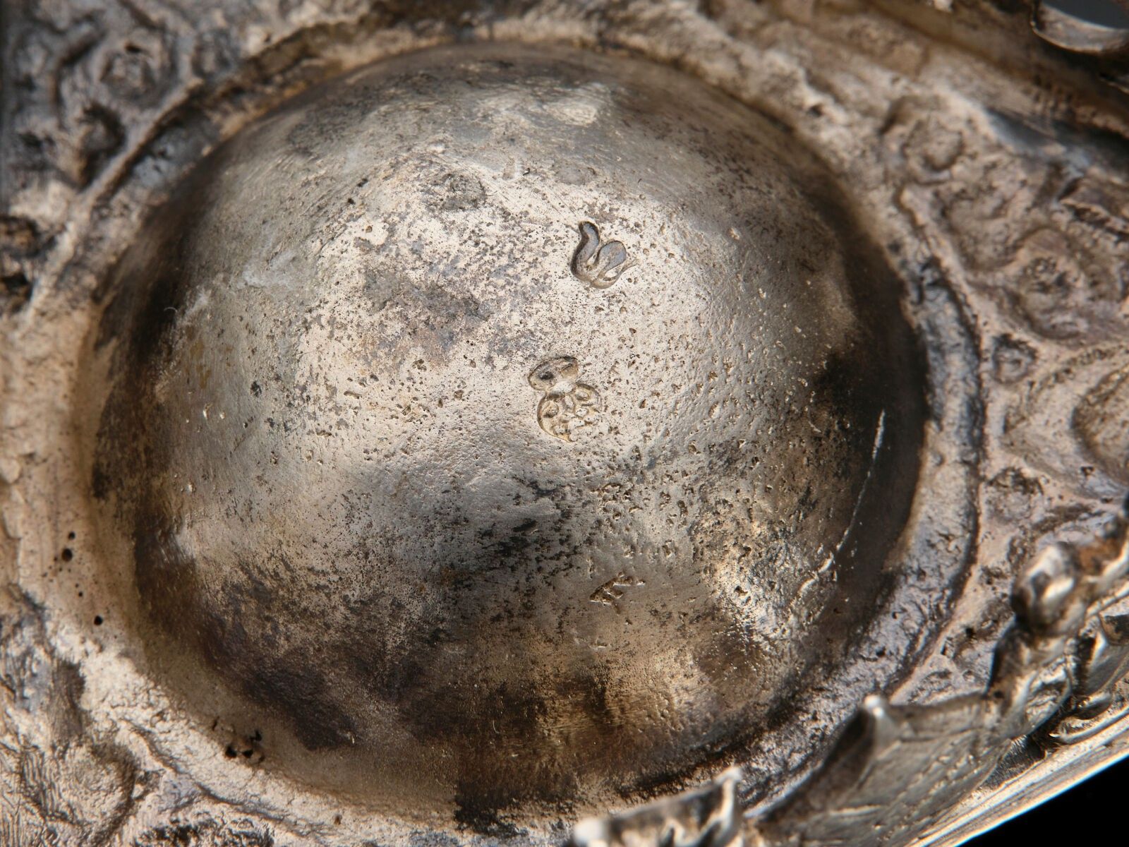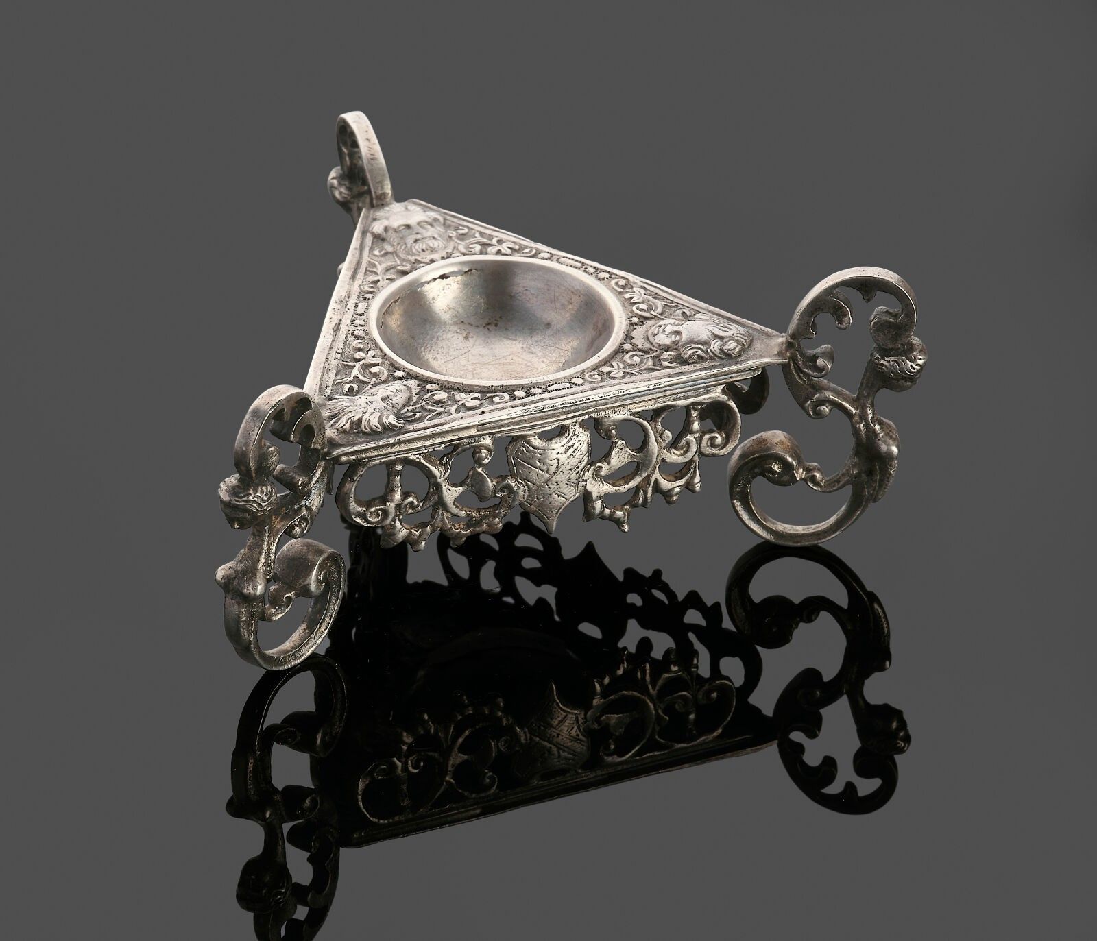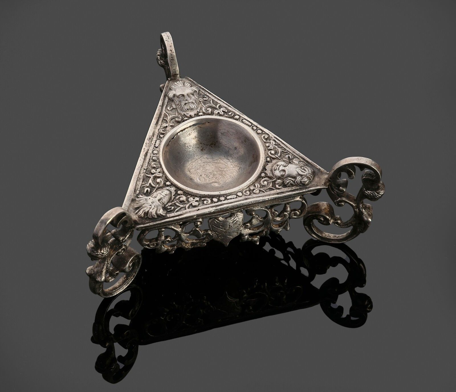 Triangular, tripod salt cellar in silver 800 thousandths decorated with masks, foliage and coats of arms (hallmarks).