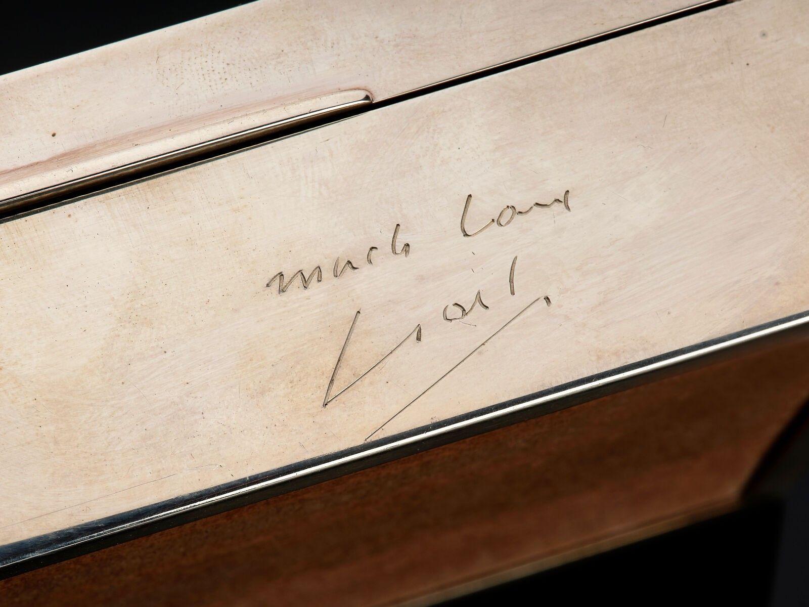 Signed in all letters. The lid engraved "JEN" and on the side "Much Love, Karl".