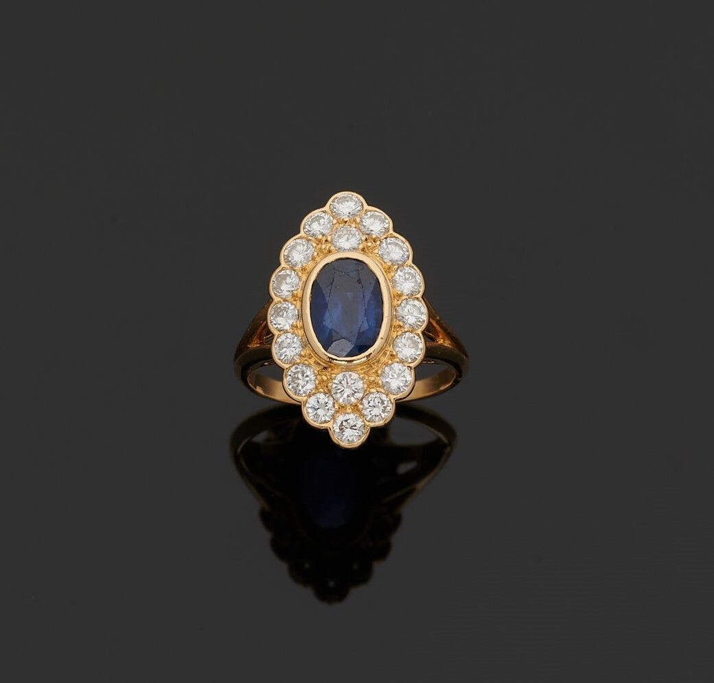 18 k (750 thousandths) yellow gold navette ring set with a sapphire surrounded by diamonds.
