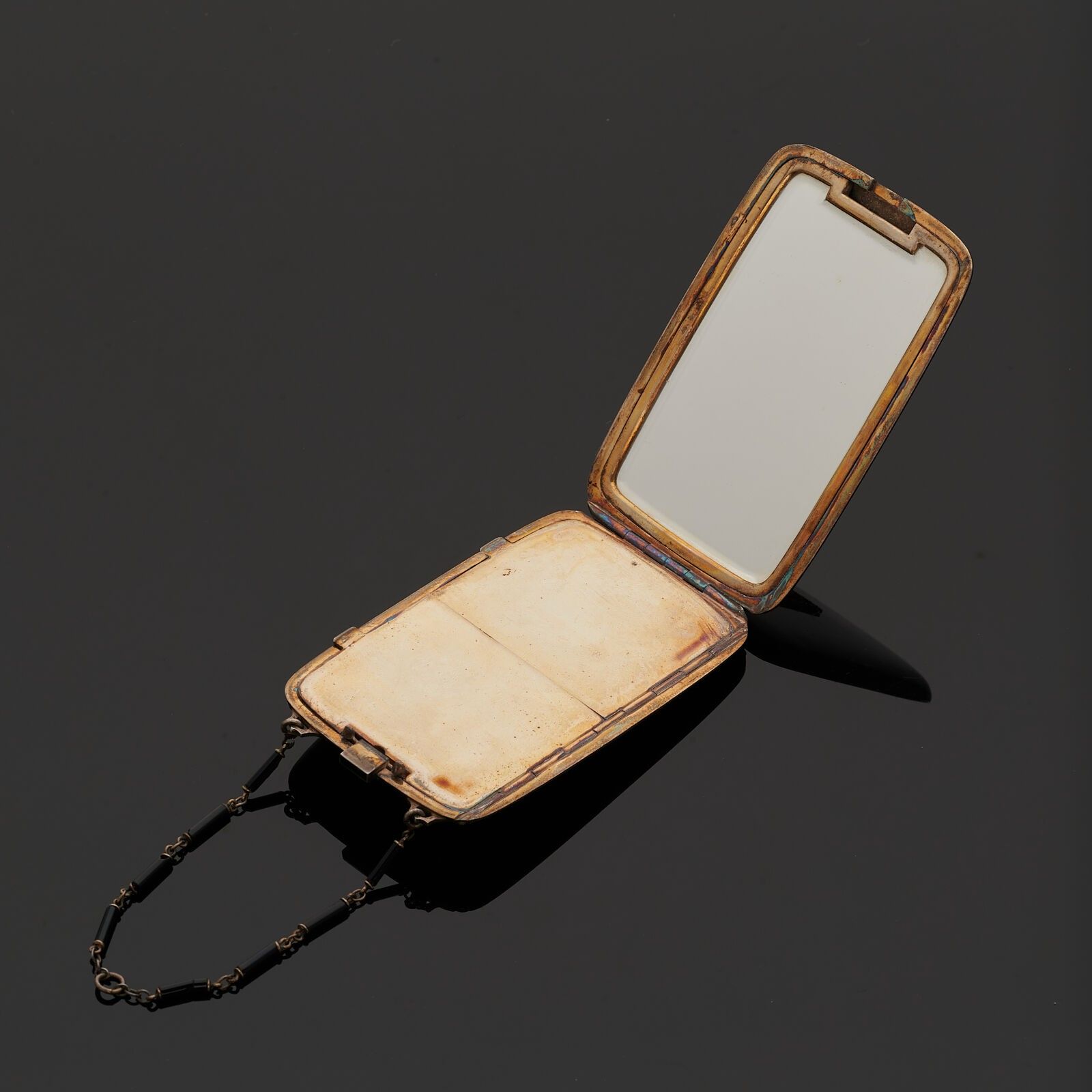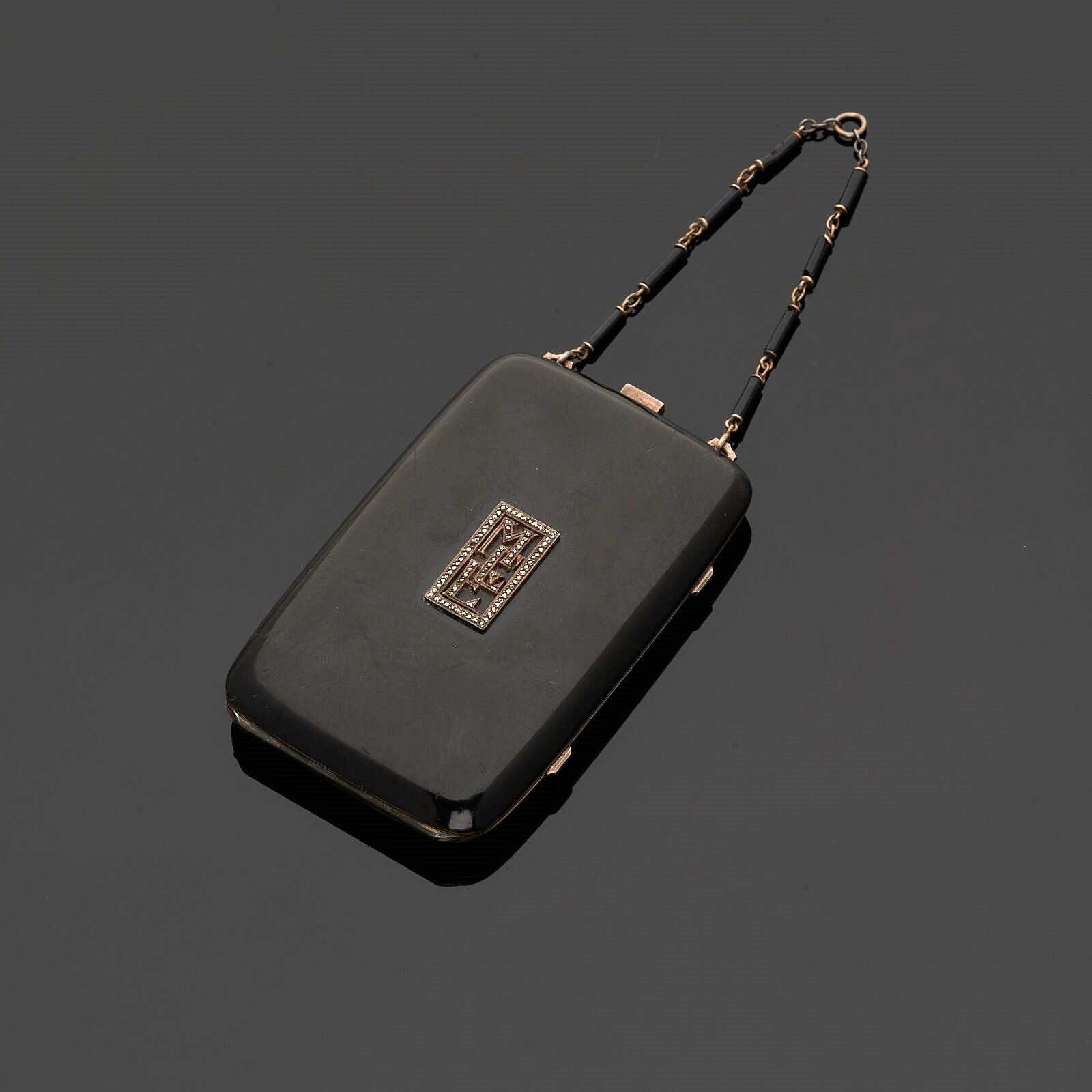 BLACK STARR & FROST - Black lacquered vermeil minaudière revealing two compartments. Cyphered M.C.E. With its original chain (small lacks on the crimp of the cyphering).
