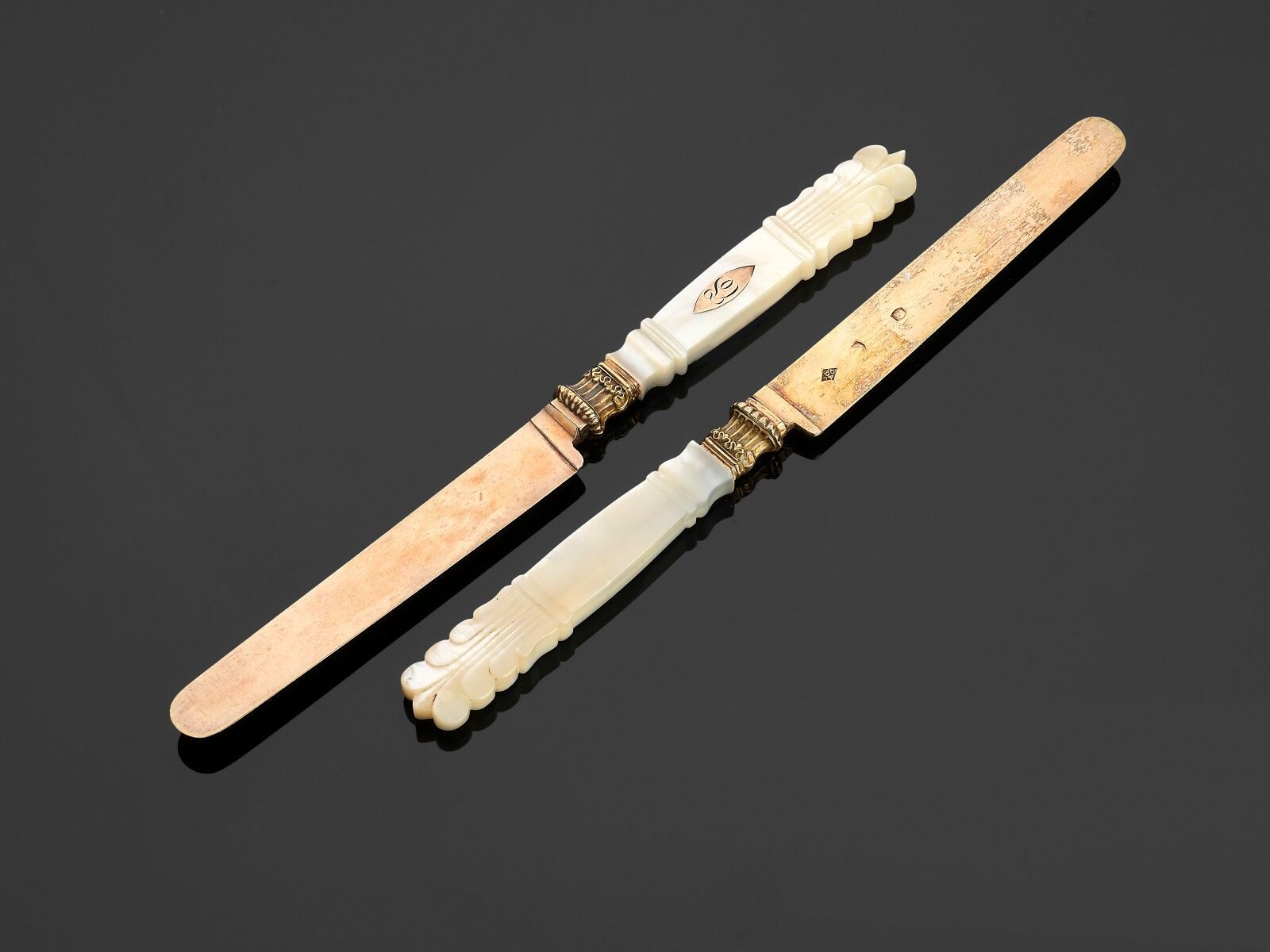 Two knives with blades and ferrules in 800 thousandths vermeil, the handles in mother-of-pearl carved with palmettes decorated in inlay with a shuttle engraved with a monogram "TS".