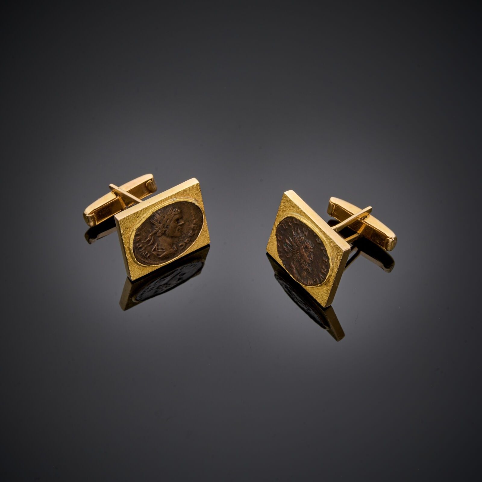 Pair of cufflinks in 18k (750 thousandths) yellow gold, each set with a patinated copper plate in the style of an antique coin.