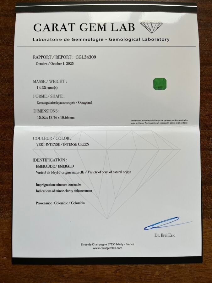 CGL certificate dated 1 October 2025 N° CGL34309 indicating emerald 14.35 carats, intense green, Colombia, minor impregnation noted.