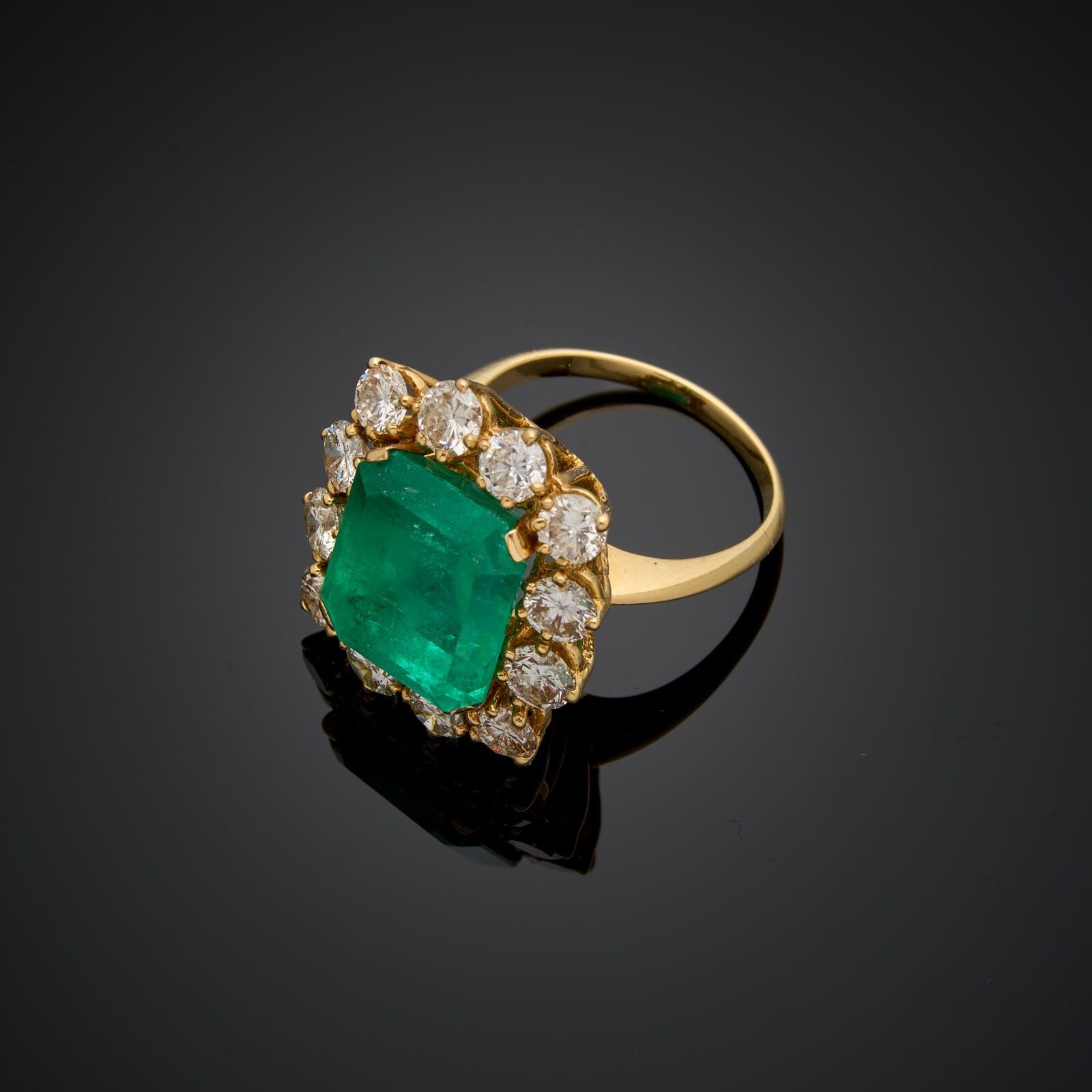 18 k (750 thousandths) yellow gold ring set with a 14.35 carat emerald surrounded by diamonds.