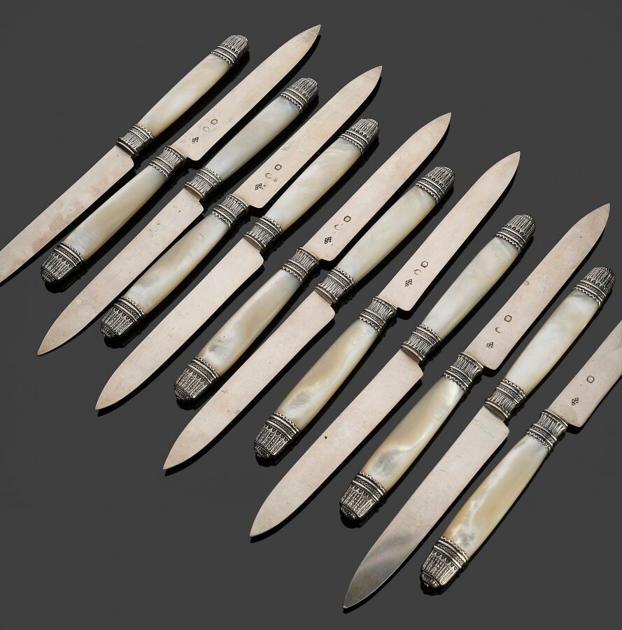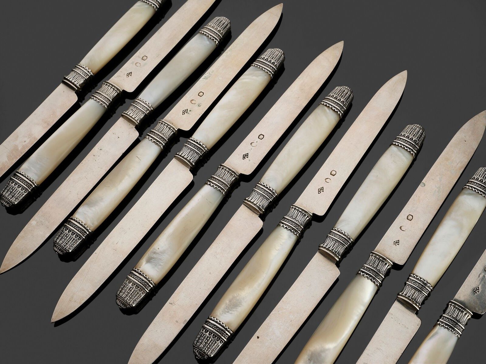 Twelve dessert knives, silver blades, mother-of-pearl handle…