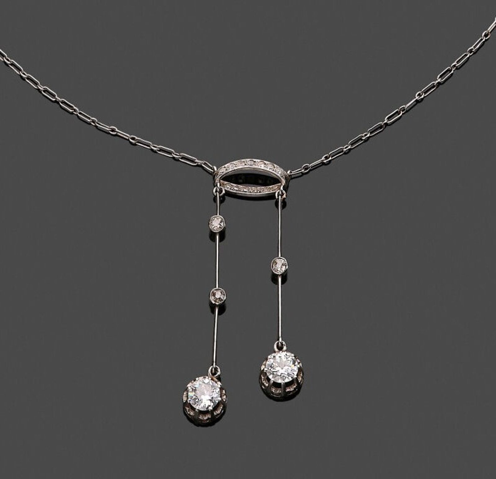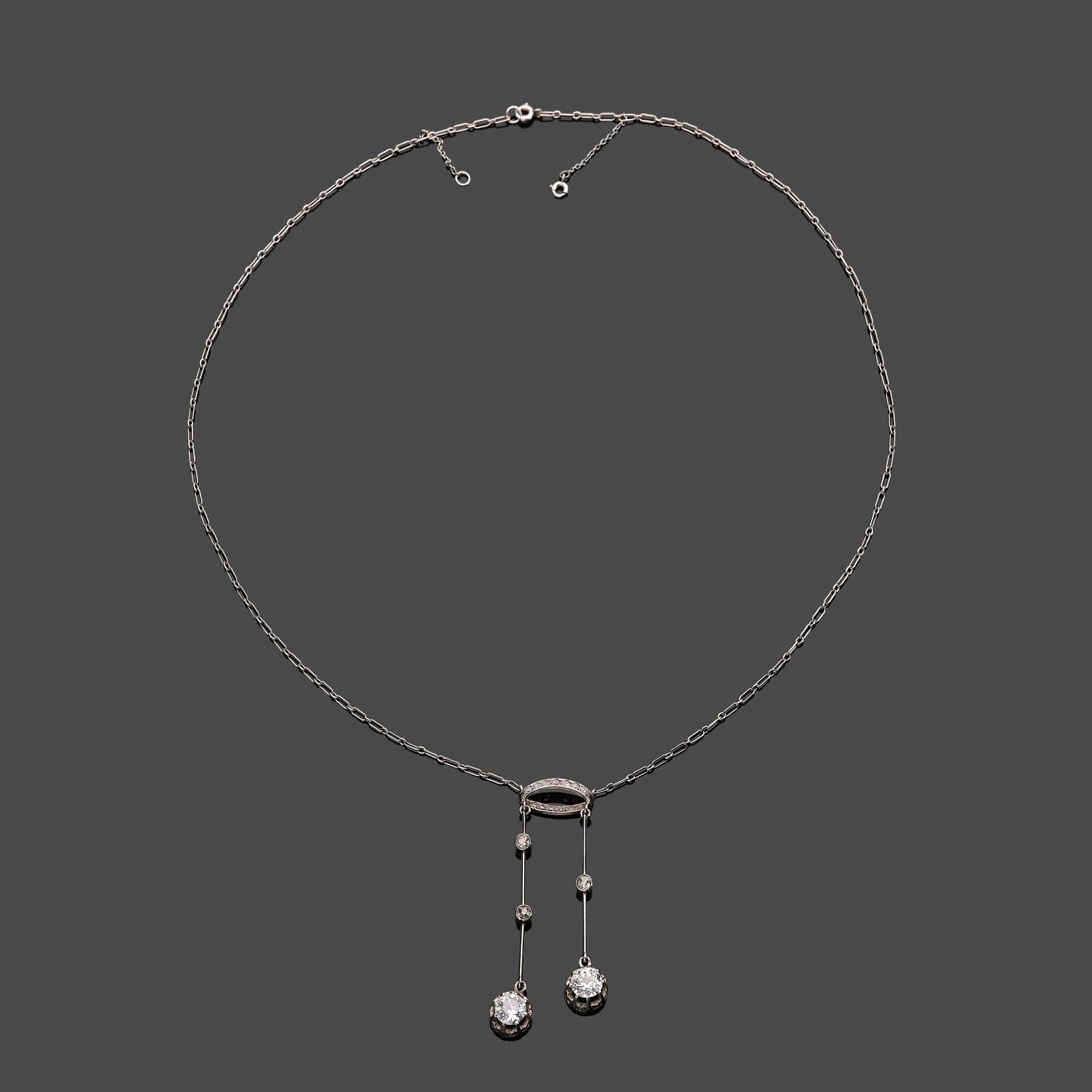 Negligee necklace in 18 k (750 thousandths) white gold set with two half-cut diamonds weighing approximately 0.6 and 0.7 carats and small old-cut diamonds.