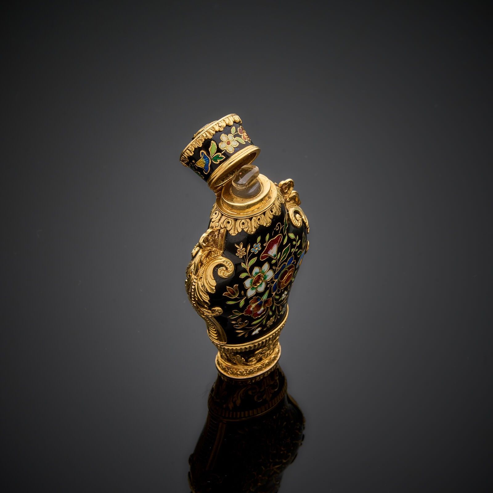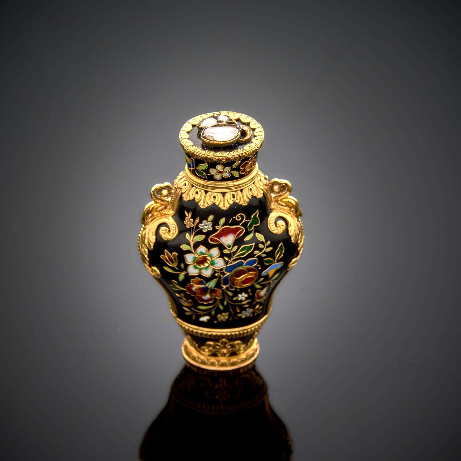 An 18k (750 thousandths) yellow gold salt flask with a chased, guilloché and polychrome enamel decoration on a black background of bouquets of flowers. The jambs are chased with foliage and fluted friezes. The lid is set with rose-cut diamonds, revealing its original crystal stopper. The base is engraved with the initials "AS".
