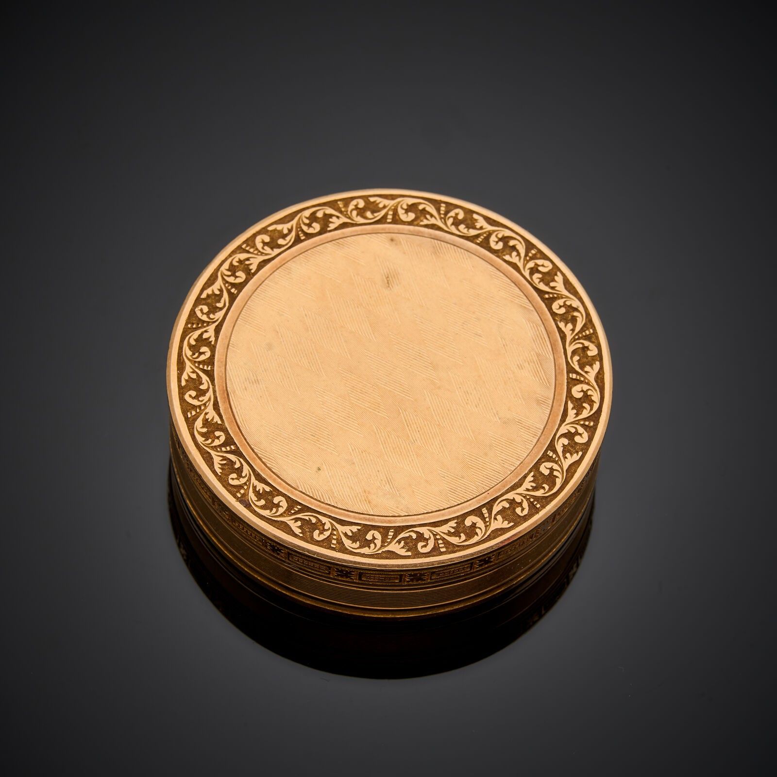 Round snuff box in 18k yellow gold (750 thousandths) with engraved and guilloché decoration of lozenges and foliate friezes (small impact to the bottom of the box).