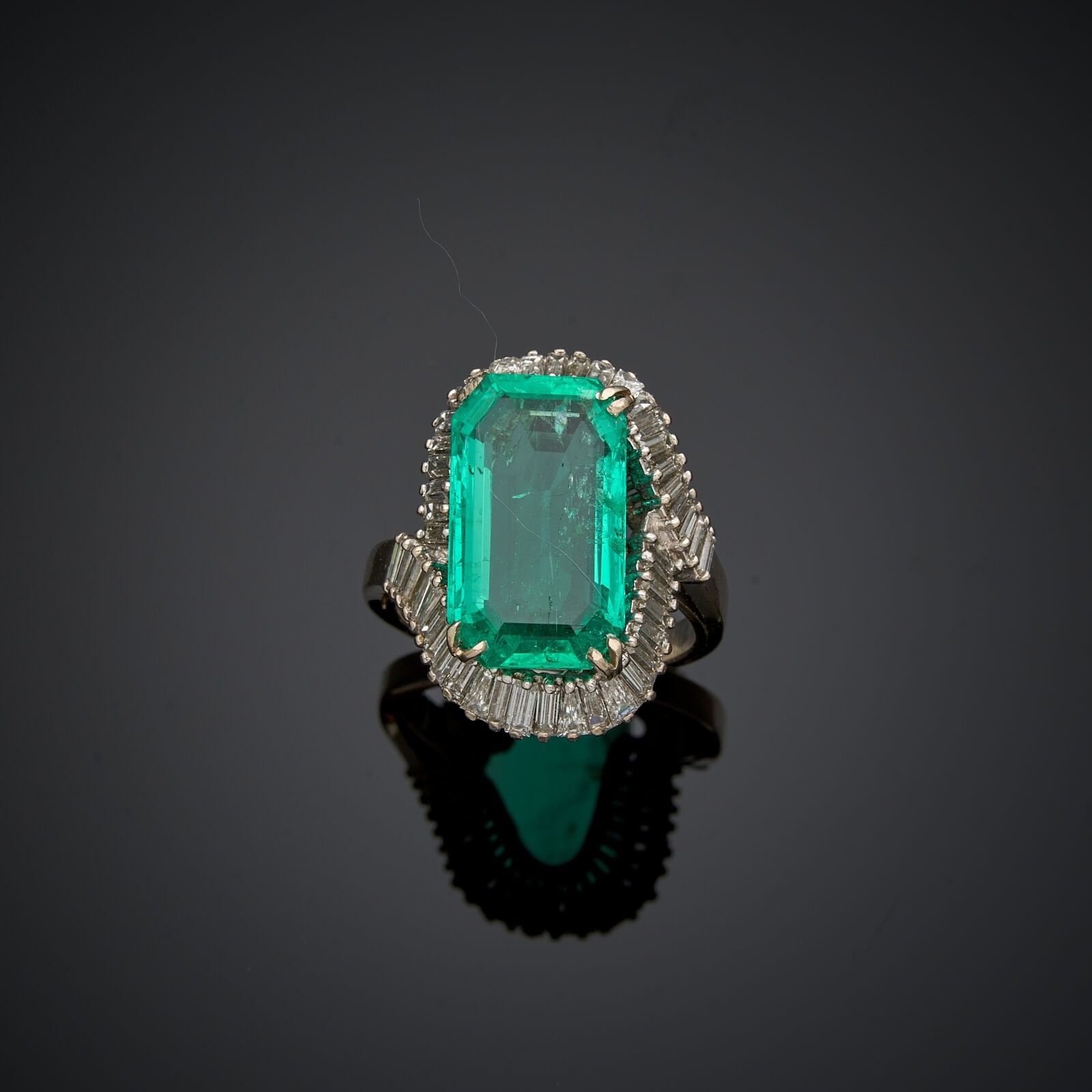 18 k (750 thousandths) gold ring set with a 7.28 carat rectangular emerald in a ribbon of baguette-cut diamonds.