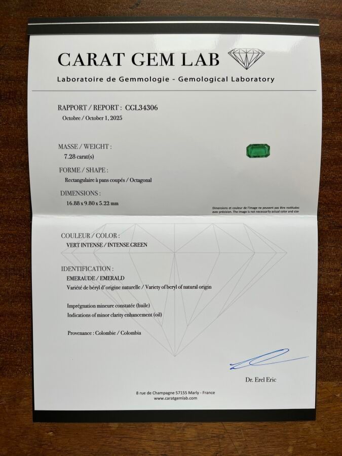 CGL certificate dated 1 October 2025 N° CGL34306 indicating emerald 7.28 carats, intense green, Colombia, minor impregnation noted (oil).