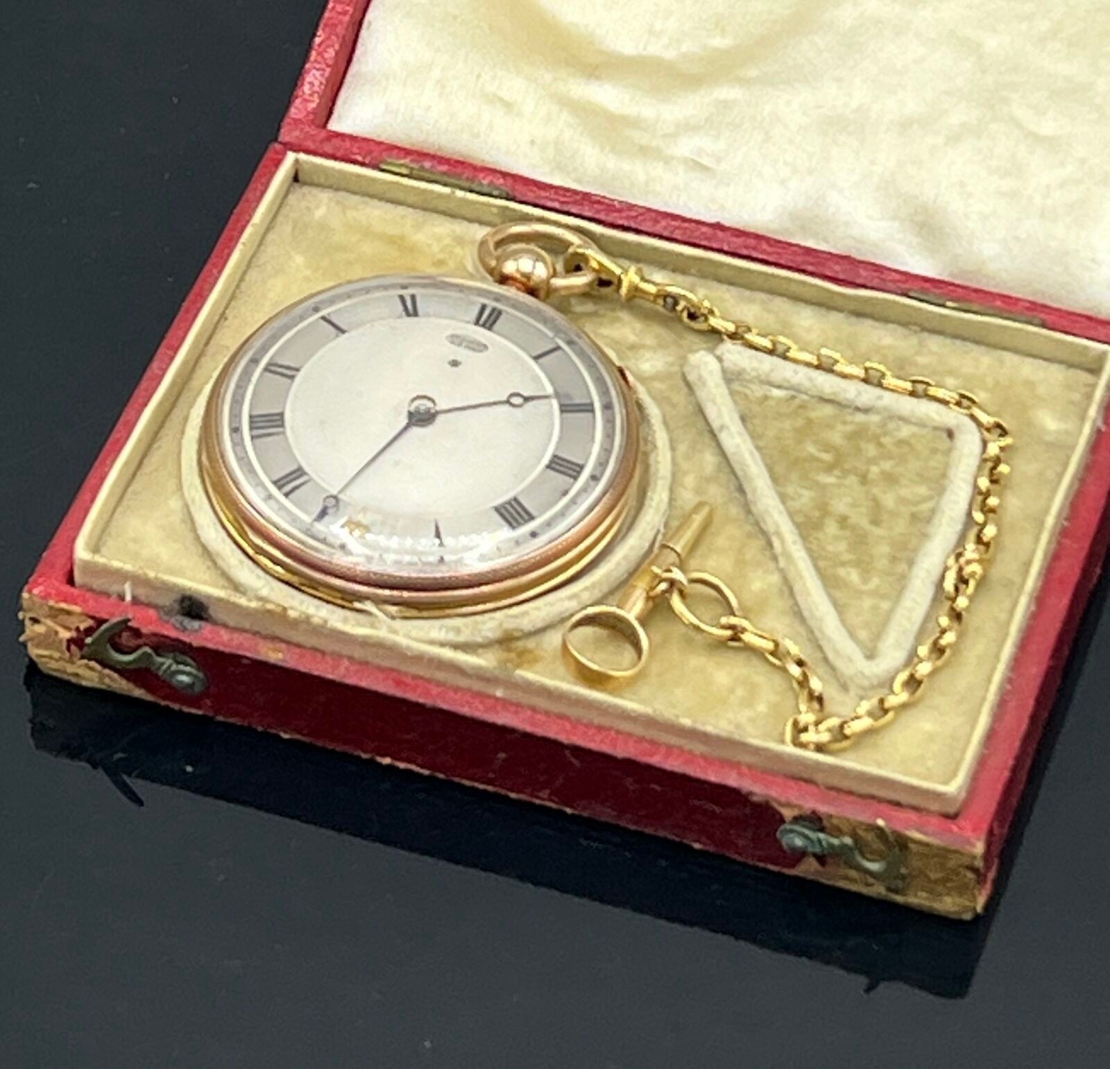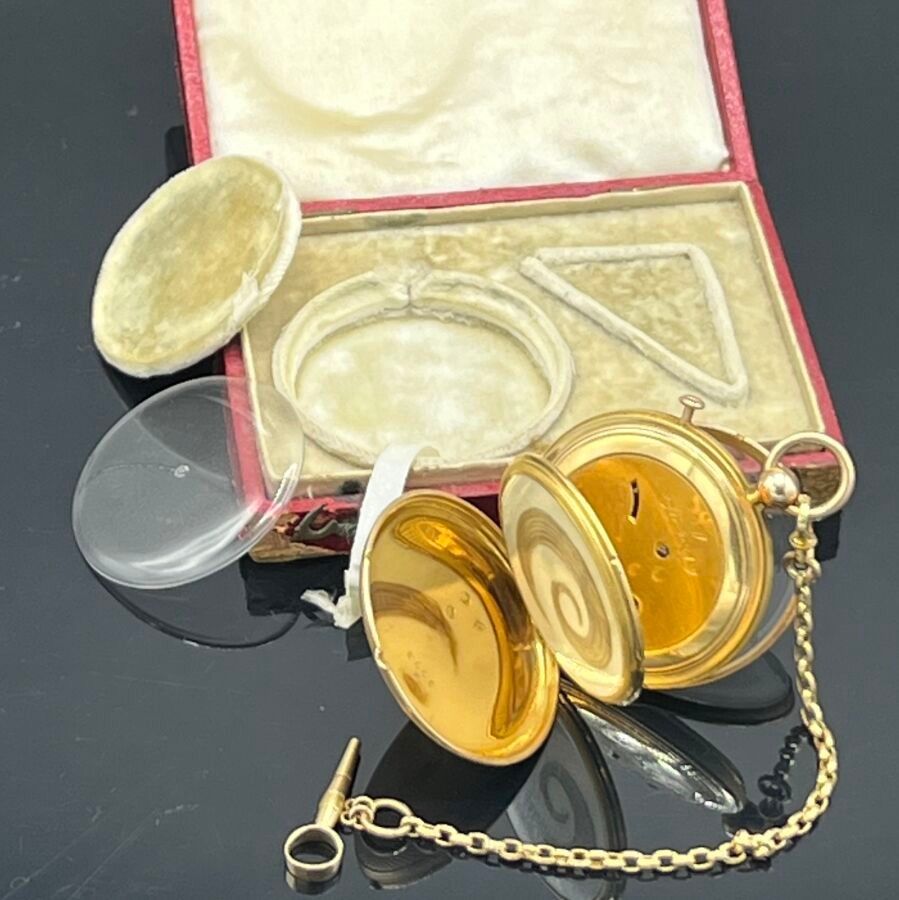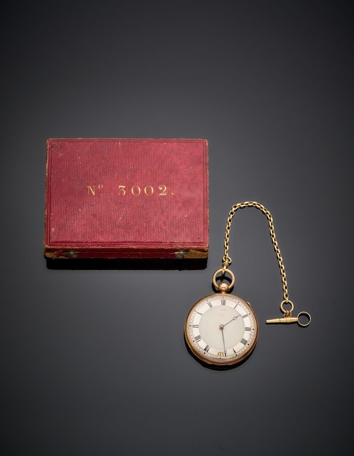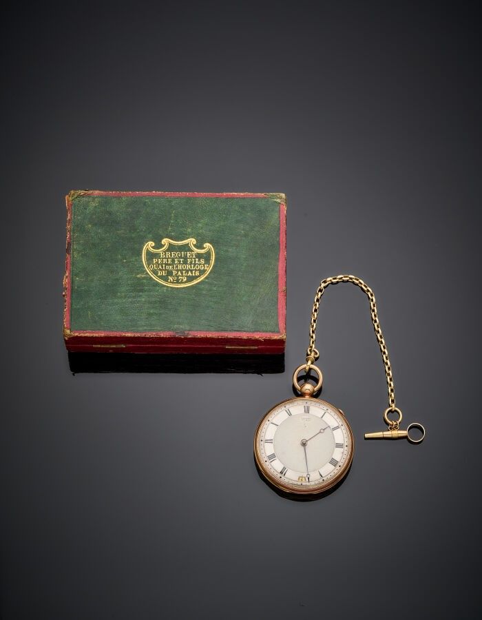 With its original red morocco case, gilded with small irons, numbered 3002. On the reverse, green morocco, signed "Breguet, père et fils, Quai de l'Horloge du Palais, N° 79" in an escutcheon. One replacement glass. An 18K (750 thousandths) yellow gold chain with a key (Length: 13 cm, Gross weight: 6.3 g).