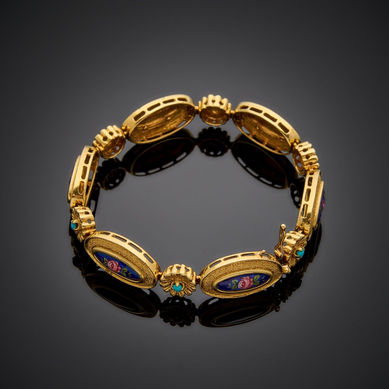 Bracelet in 18 k yellow gold (750 thousandths) decorated with oval medallions enamelled with flowers on a blue background and alternating with flowers set with turquoise. Eight safety pins.