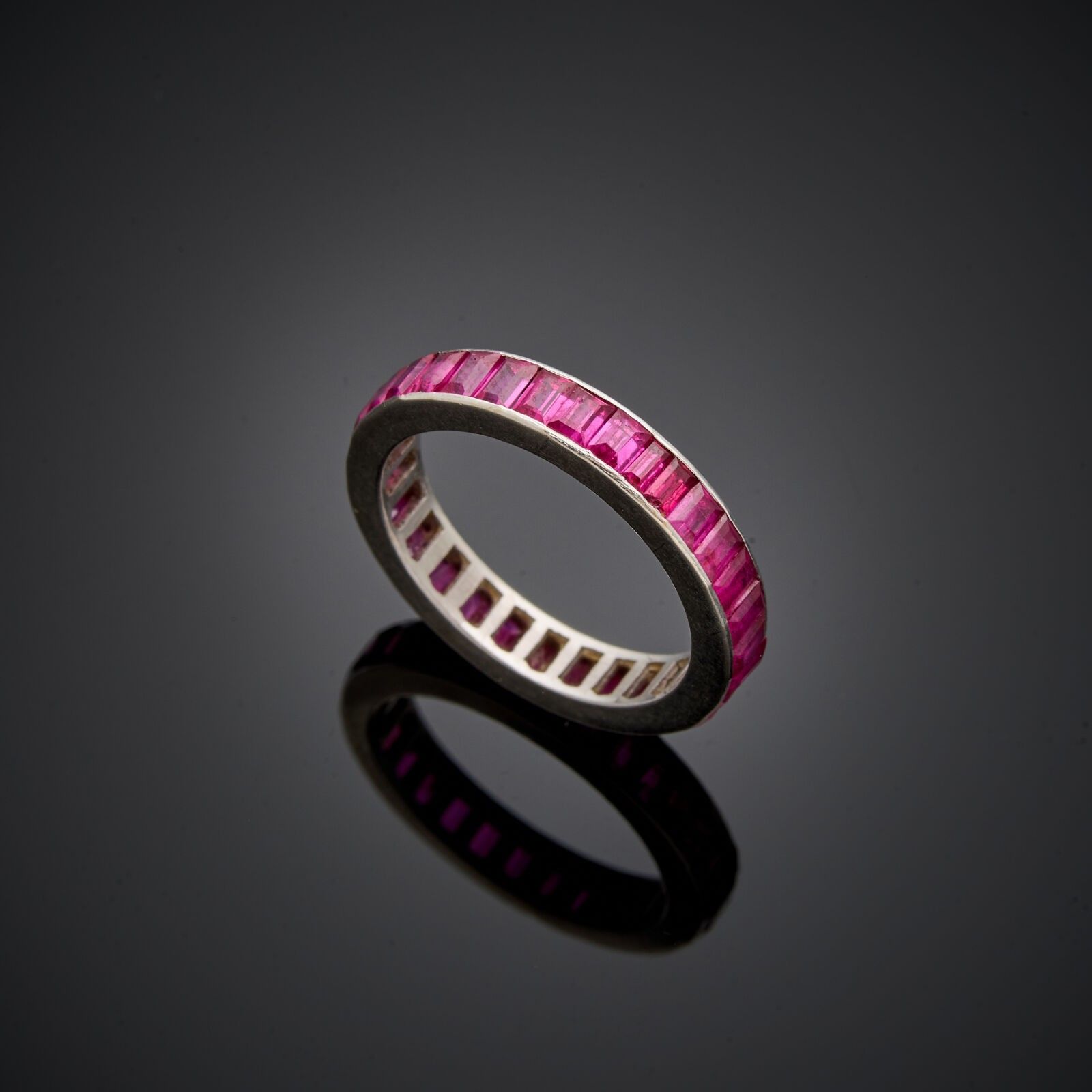 American wedding band in 14 k (585 thousandths) white gold set with calibrated rubies.