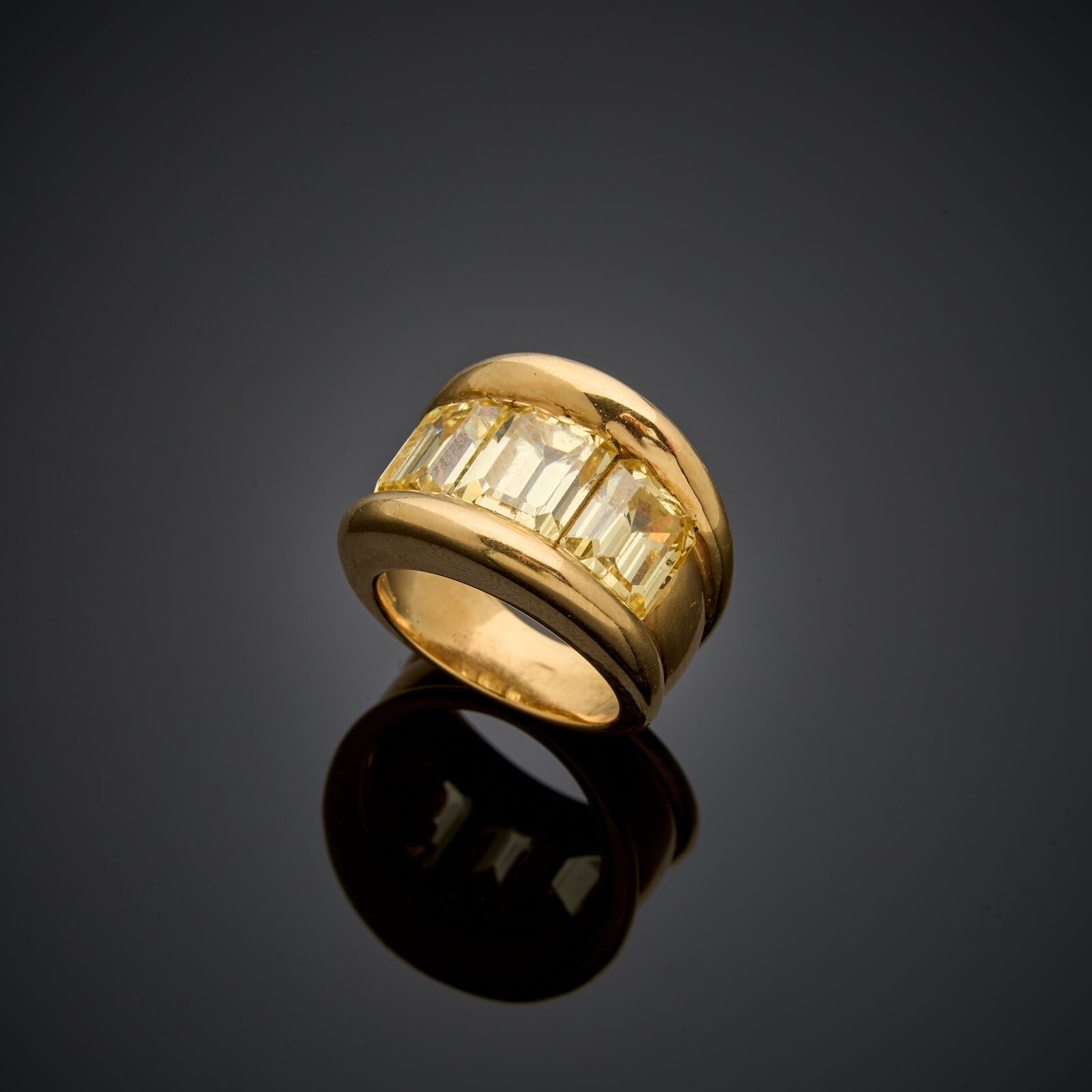 18 k (750 thousandths) yellow gold band ring set with three citrines.